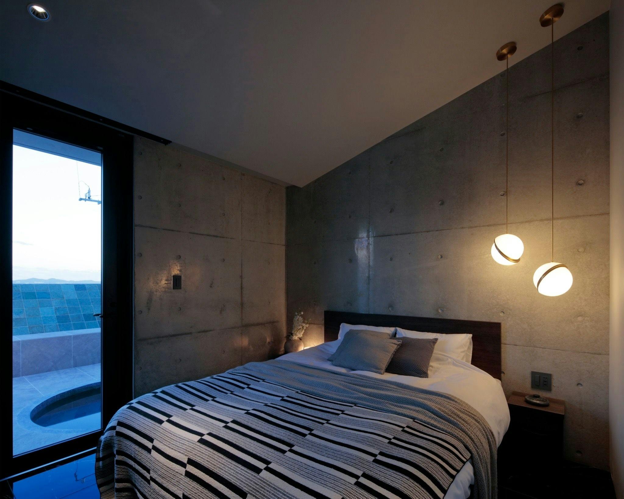 滝が流れる鮮やかなグリーンの大理石を使用したプールは、天気の優れない日でも鮮やかに輝き、外を眺めながらくつろげる空間を実現しています。