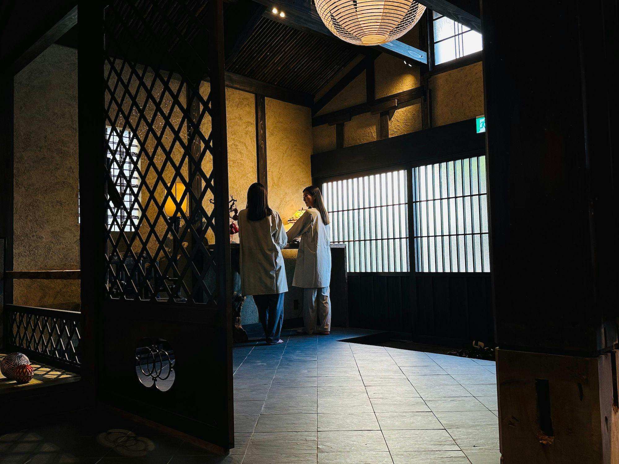 表門から行燈に導かれるように庭園を抜けて宿建物へ。引き戸の向こうは広い土間。格子越しに紅色鮮やかな大津壁の小上がり。掘りごたつの食事室から浴室、廊下に至るまで、思わず撮影したくなる艶やかな設えに胸が躍ります。