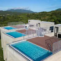以下のような設備や特徴があります。 一棟貸切・キッチンあり・洗濯機あり・寝室複数・駐車場あり・食料品の持込可・プールあり