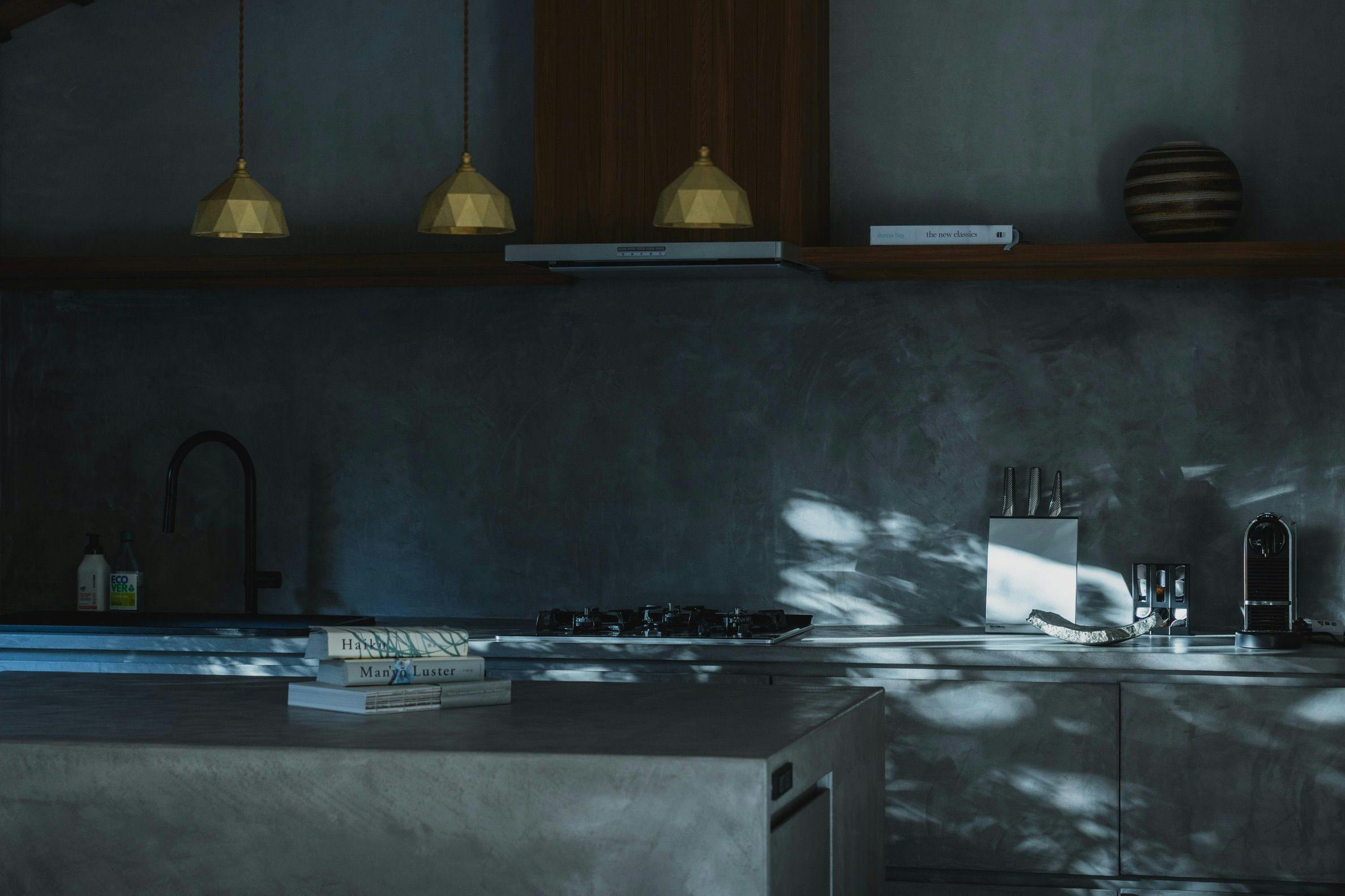 アイランド型のモダンキッチンには厳選した器や調理器具が揃っています。 プライベートシェフによるコース料理を楽しむディナープランもご用意しています。