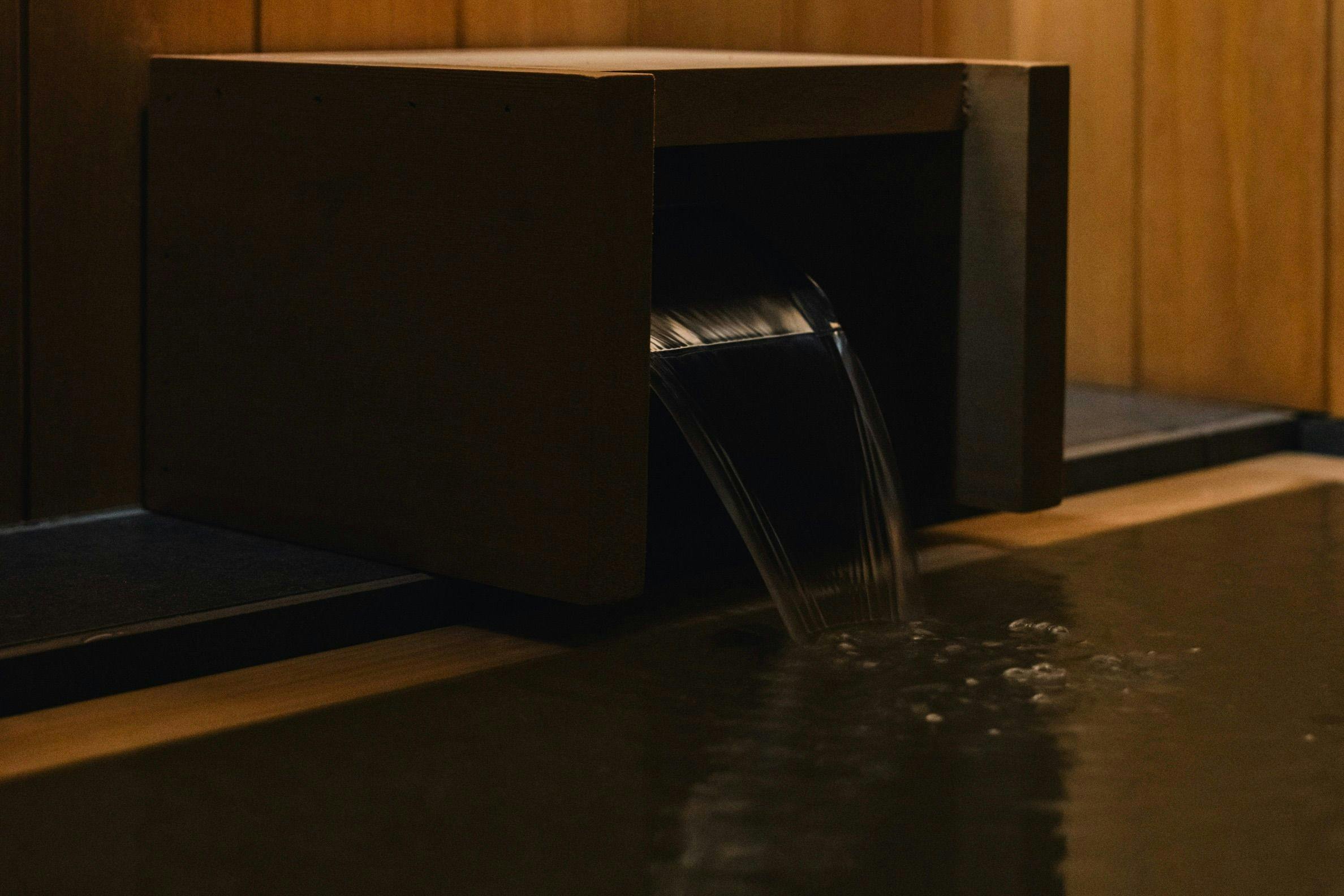 【水風呂】敷地内から湧き出る井戸水を使用。 深さ4.5mと浅めの井戸にも関わらず大変豊富な水量で、さらに年間の温度差の影響を受けにくく、夏と冬の水温の温度差が1℃程度という特徴があります。 優良な水質を誇る水風呂でサウナ体験をより上質なものに。 水風呂のあとは、鎌倉石の洞窟や竹林を臨むユニークな外気浴スペースでゆったりと。