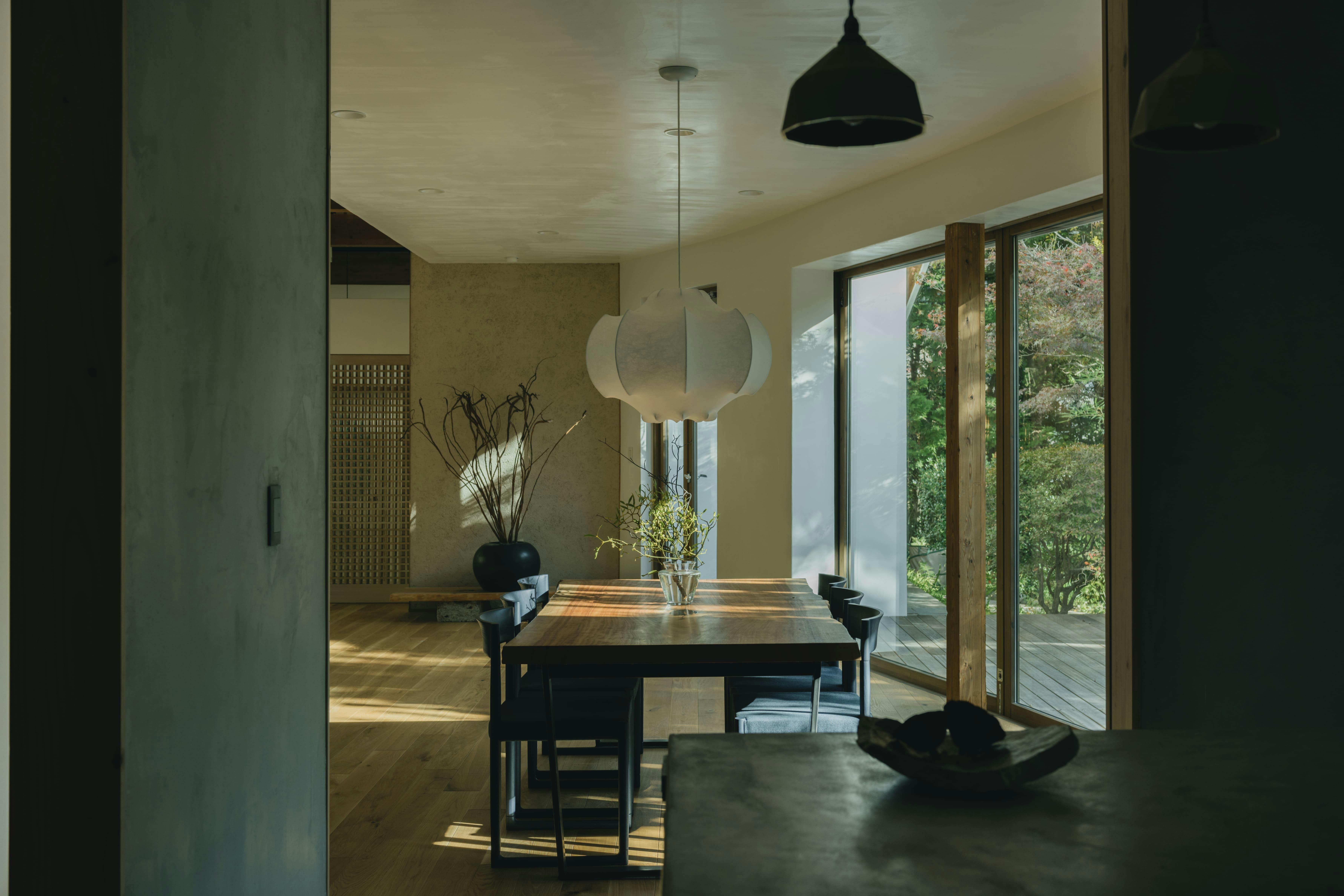 “自然と集まる” 設計のダイニングは、広縁からの素晴らしい景色と圧倒的な開放感が特徴です。 床暖房完備で冬も心地よい暖かさ。