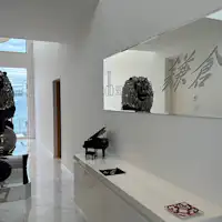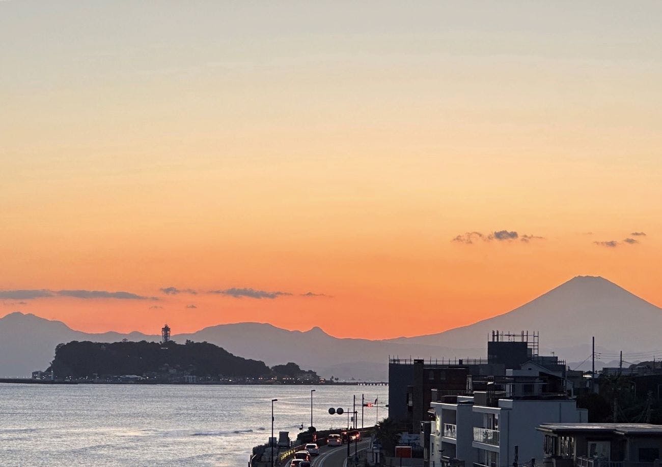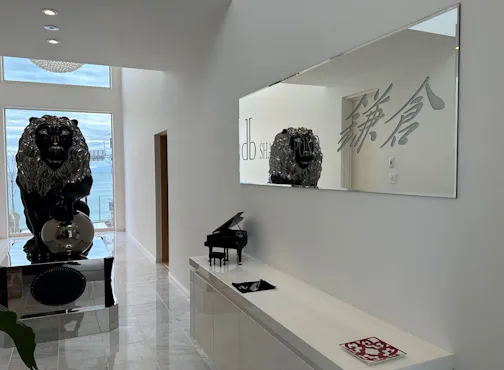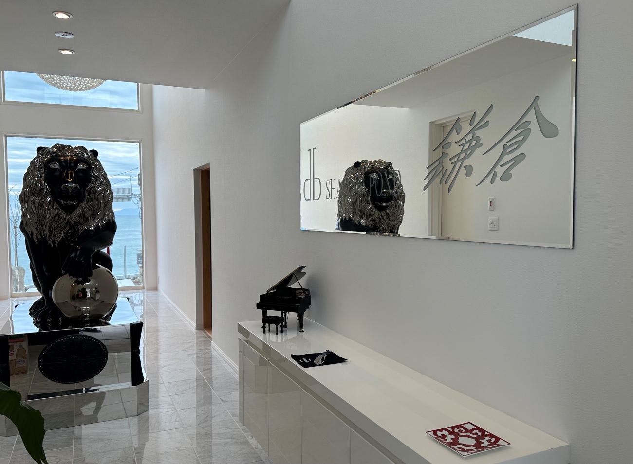 134R沿い、稲村ケ崎にある「シャドーポンド鎌倉」。1階の玄関扉を開ければポンド君がお出迎え、ポンド君が置かれたホールは全て吹き抜け、ホール以外は和風になり、8帖の2間続きの和室の1室は庭に枯山水、その前には相模湾、もう一室は2つの床の間があり本床には仁王像が置かれています。その2間を仕切っている建具には、赤富士と龍が描かれており、建具を収納すれば、16帖の広々とした1つの和室となります。そして内風呂には御影石を使った4~5人が入れるお風呂、ロウリュが付いた3人程入れるサウナ、内風呂とサウナからも相模湾が一望でき、内風呂から外に出れば岩の露天風呂があります。大島、江ノ島、富士山が一望でき、夜にはライトアップした枯山水がとても情緒があります。 2階には3部屋の洋室、そして渡り廊下から見るシャンデリアはとても綺麗です。3階には35帖のリビングがあり、真っ白なリビングに真っ赤なアイランドキッチンがまるで島のように浮いているみたいでおもしろいです。3階のトイレの窓から見る稲村海浜公園はまるで壁に飾られた絵のように見えるところも楽しんでいただけます。 テラスには5人用のジャグジーがあり、また稲村海浜公園、大島、江ノ島、富士山を見渡すことが出来ます。サンセット時の景色を見て頂き、本当のオーシャンフロントで波の音を聞きながら大人のゆったりした休日をお過ごしください。