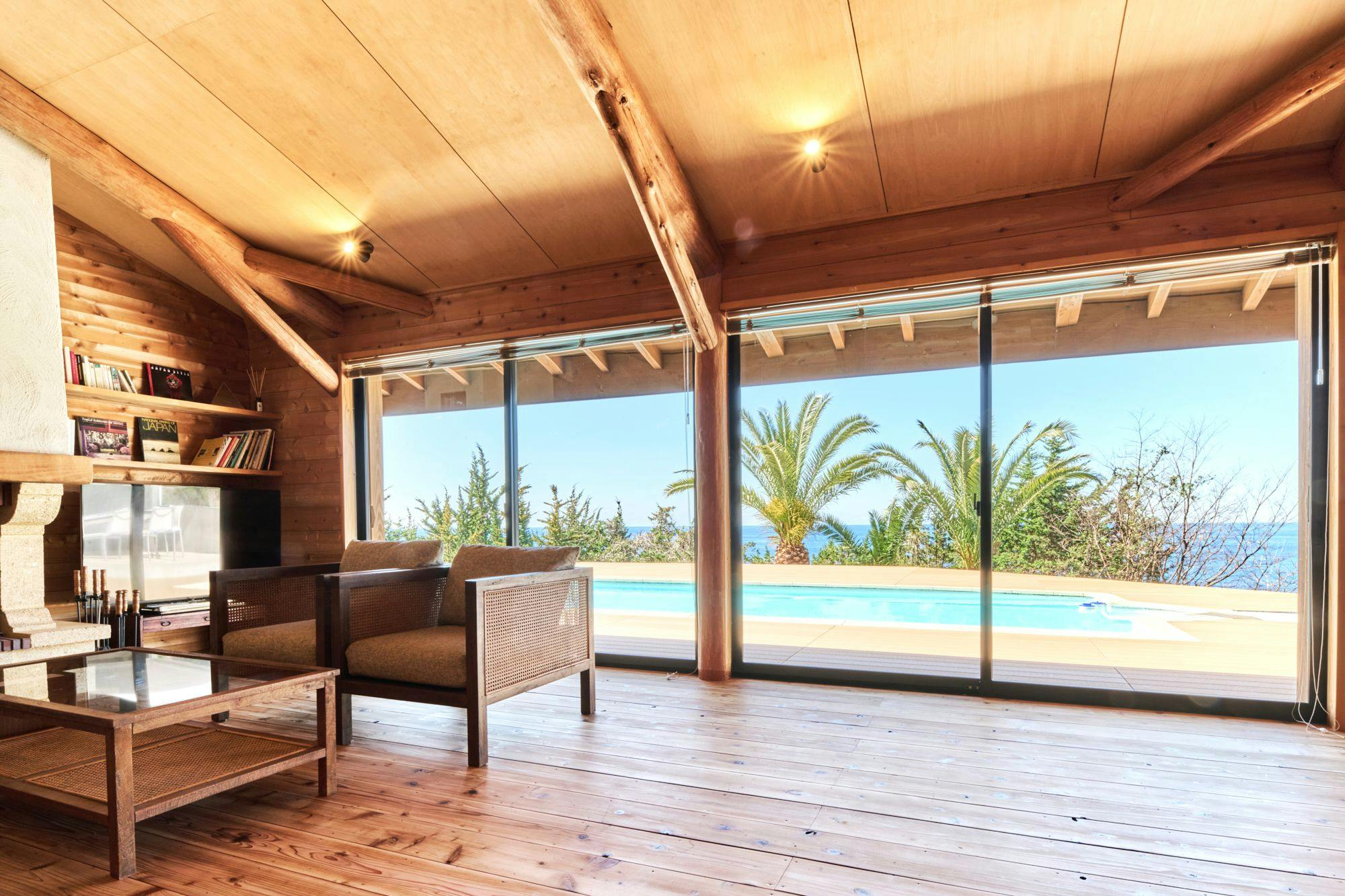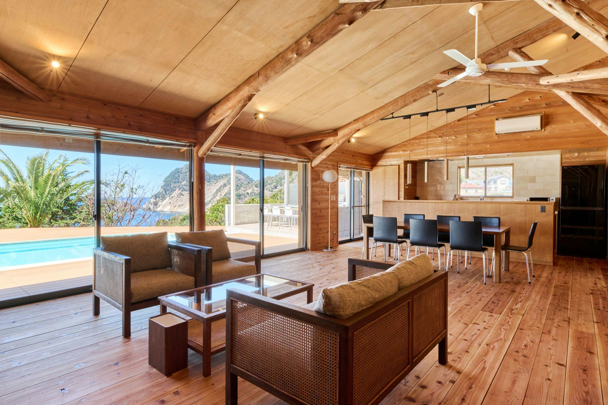 自然残る南伊豆の平屋建てリゾートハウス。全室オーシャンビューで、視界には、ヤシの木越しに水平線が広がり、耳に入ってくるのはトンビとウグイスの声、ヤシの葉を揺らすサラサラとした風の音。夜には、静寂の中降り注ぐほどの満点の星空が広がります。 ウッドデッキのリゾートソファーでくつろぎながら、自然の音しかしない優雅なひと時をお過ごしくださいませ。