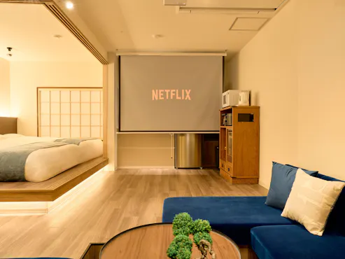 お部屋にはプロジェクターをご用意しており、YouTubeやAmazon Prime Videoをご視聴いただけます。大画面で映画や動画をお楽しみください。