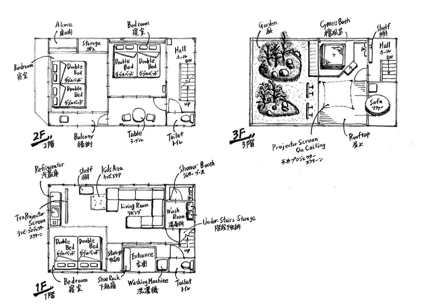 3階建て一棟貸しのプライベート宿。屋上露天風呂と庭園を備え、家族やグループで贅沢な時間を満喫できます。
