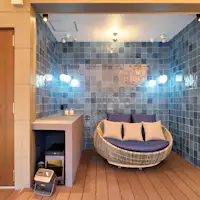 弁天町という町名は、七福神の唯一の女神「弁財天」に由来します。 元禄11(1698)年、現在の大阪市港区に大阪湾一帯で最大規模を誇る「市岡新田」が開墾されましたが、新田の完成後も水害に悩まされ、田畑は荒廃しました。この水害を鎮めるため、新田の拠点としていた会所に水に縁の深い弁財天が祀られたといいます。 水の神「弁財天」にちなみ、当施設では「美と水」を主題に掲げ内装を構想いたしました。屋上に露天風呂、シアター設備、庭園、大きなソファでくつろげるリビングルームを備えており、最新の美容家電もご用意しております。 この地の歴史に思いを馳せながら、ゆったりと贅沢なお時間を過ごして頂けることを願っております。