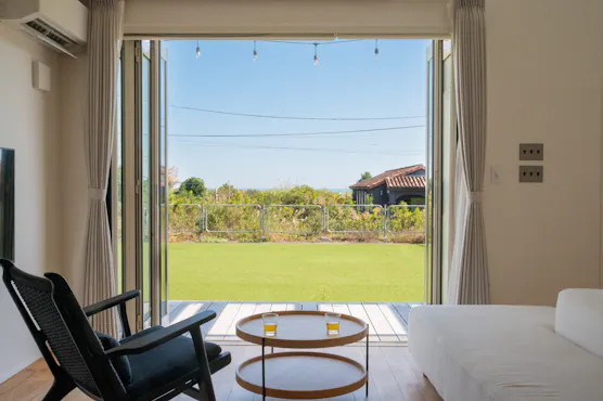 一宮海岸から徒歩5分。 四季を堪能できる広々とした庭があり海風と潮のにおいを感じながら自由でゆったりとした時間を過ごす非日常体験。 食器やキッチン用品、調味料も備え付けで、お子様連れやグループでの滞在をお楽しみいただけます。 デスクを2台完備しているのでワーケーションにもおススメ。
