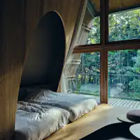 SANU 2nd Homeの特徴的な建築タイプの一つである、SANU CABIN BEE。 ハチの巣から着想を得た形状と、自然の風景を切り取る大きな窓が特徴的な独立タイプの建築です。国産木材を100%使用し、土壌環境に配慮した高床式の基礎を用いています。 天井高4mの開放感のある空間と、外に広がる雄大な景色を取り込む大きな窓が特徴的。ワークスペースやベッドスペースは曲線を描く木で緩やかに区切られ、生活、仕事、遊びすべてを叶えます。 美しい景色を見ながら朝食を楽しめる広々したテラスも、ぜひお試しください。