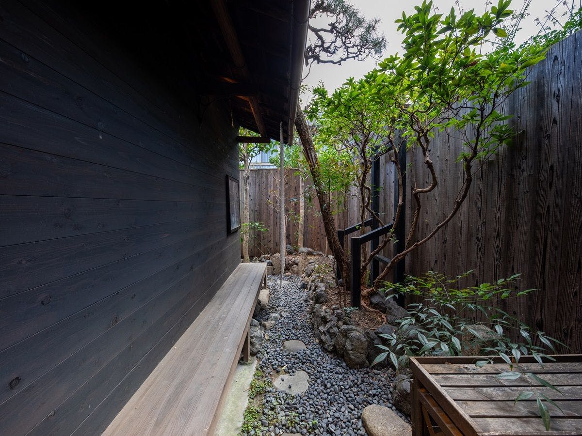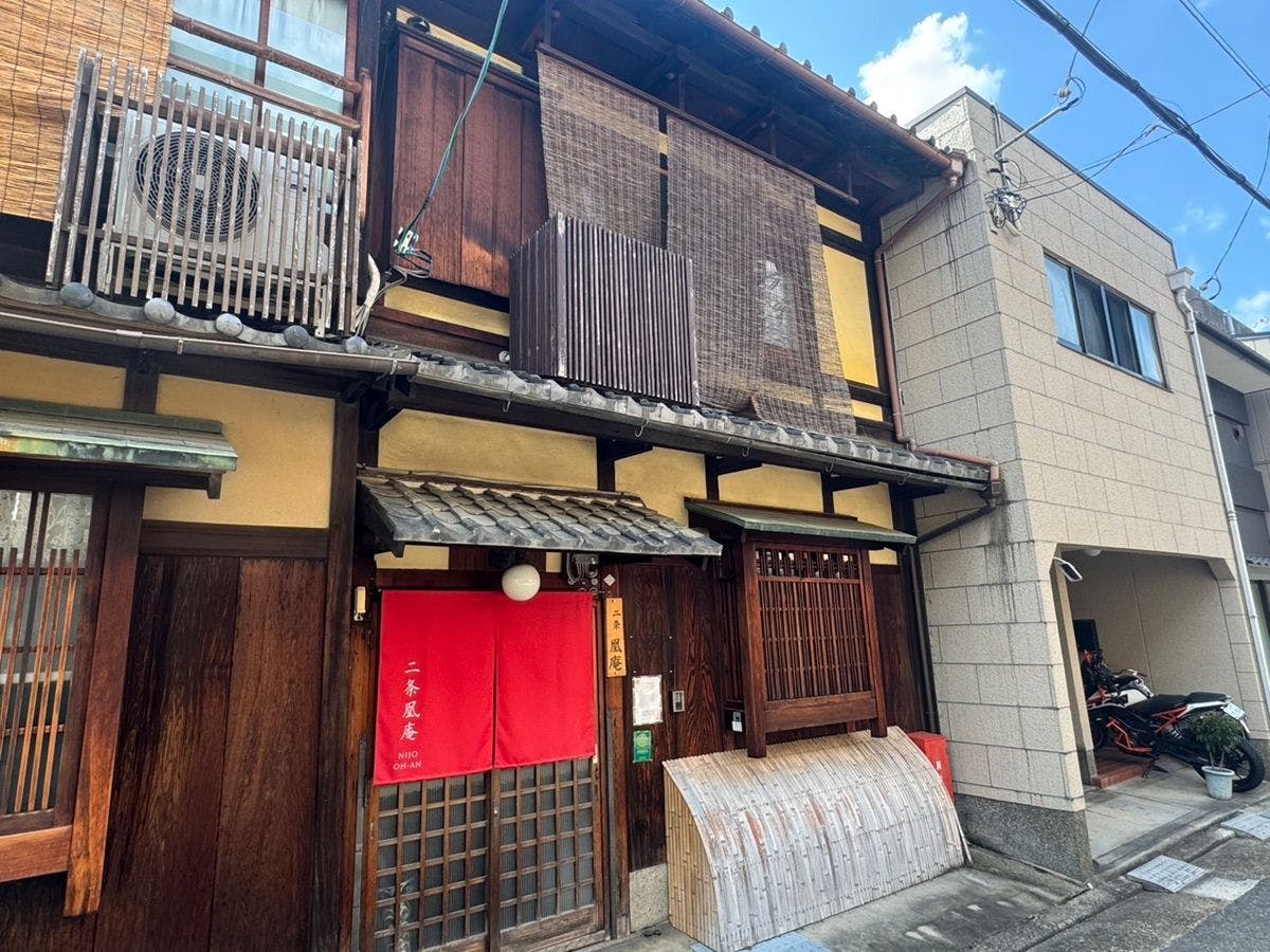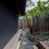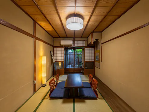 世界遺産「二条城」北の閑静な住宅街の中に位置しています。 格子や暖簾、簾などの京町家らしい佇まいを感じる外観や、玄関を開けると昔ながらの土間がお出迎えしてくれます。 室内にも古くに使用されていた柱や囲炉裏を再現した家具、檜張りの浴室には陶器浴槽を設置するなど内装にもこだわっています。 木の温もりと畳が多く広がる空間は、まるで自宅に帰ってきたような温もりと懐かしさを感じさせてくれます。