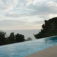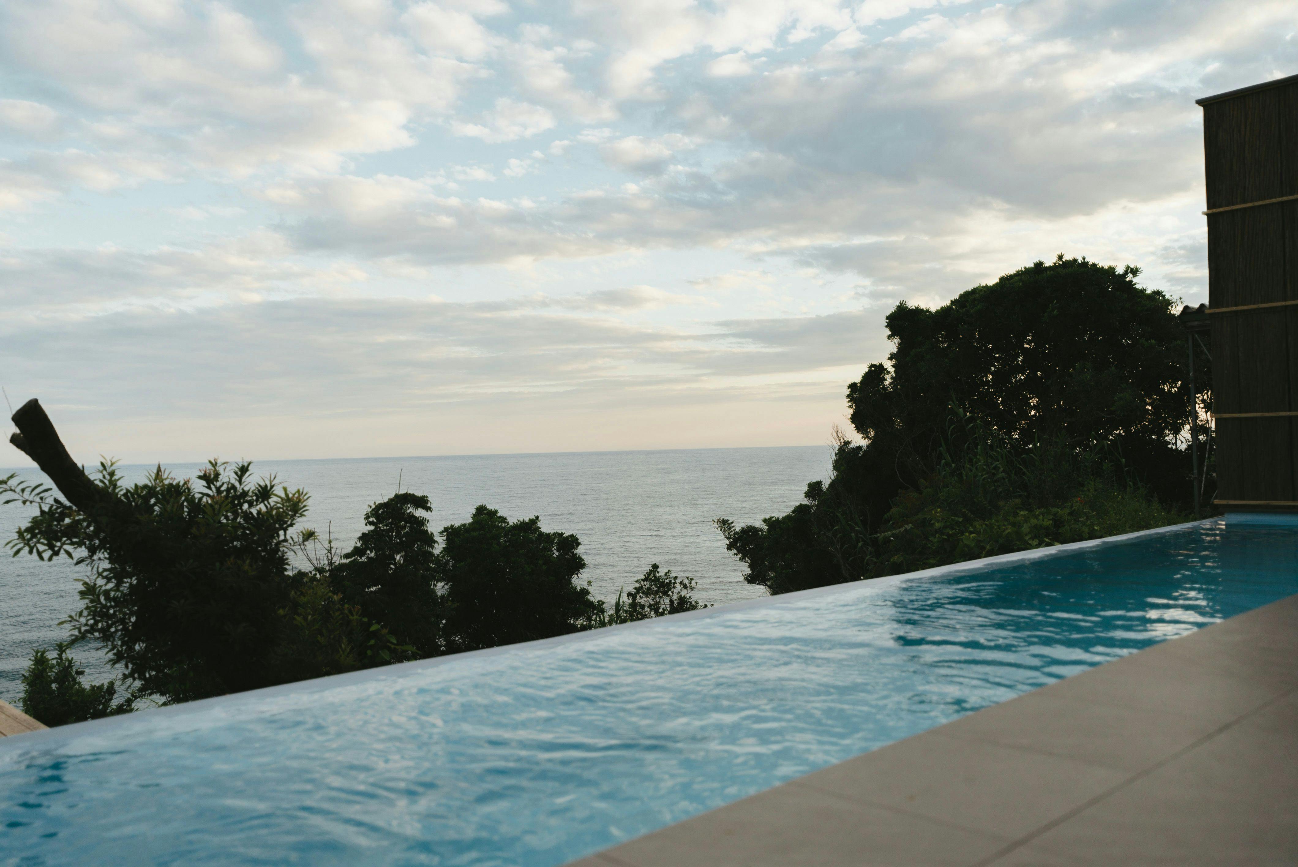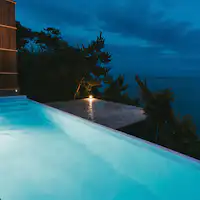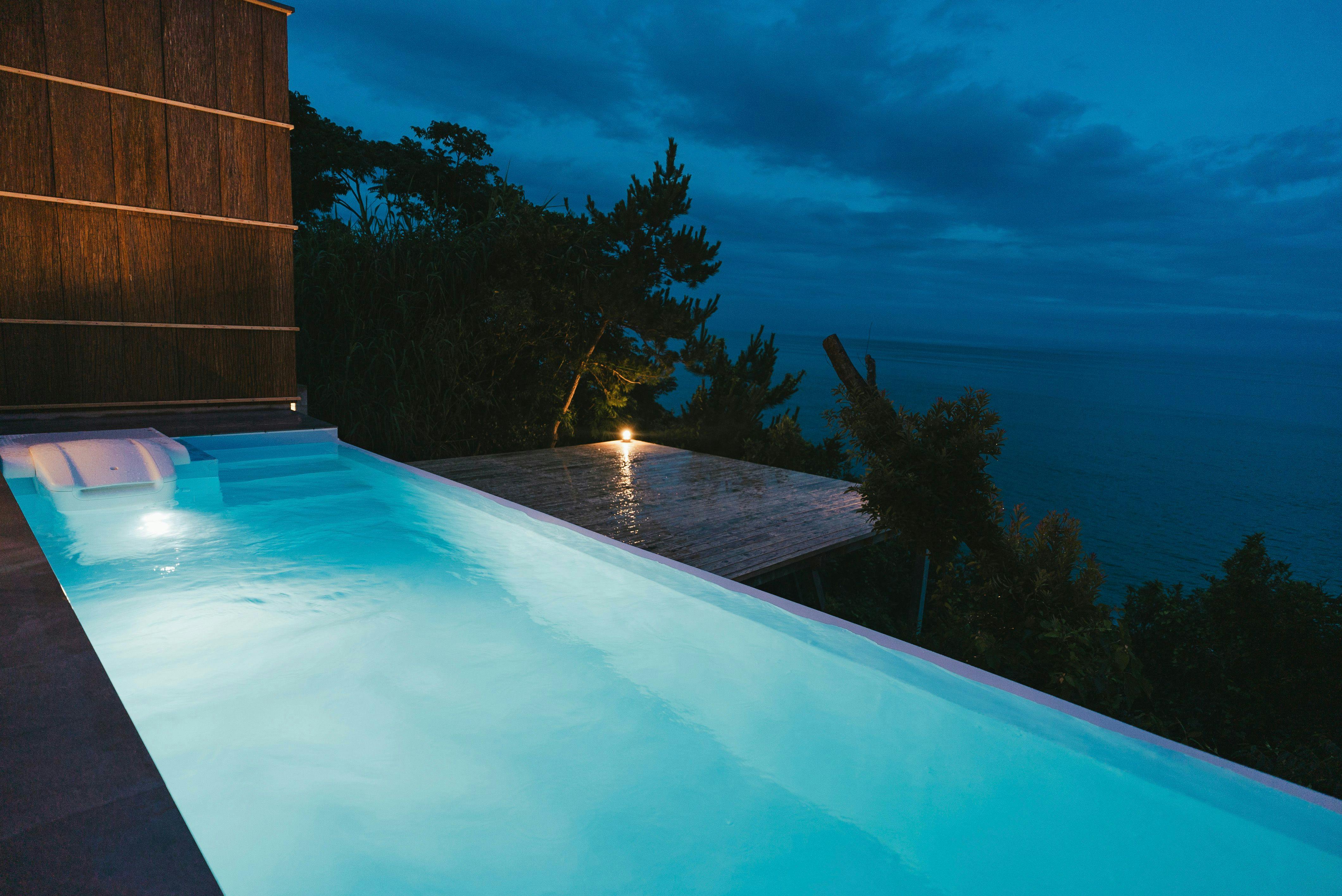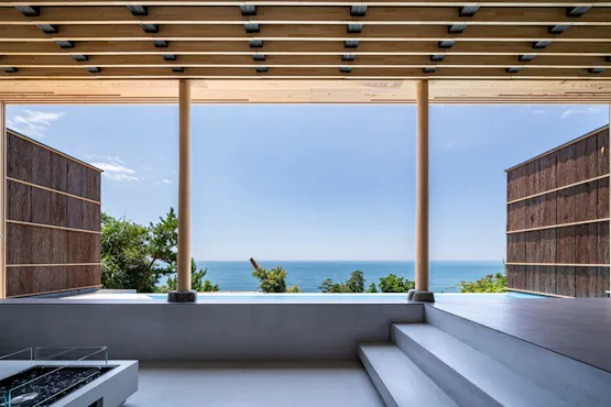 アウトドアリビングからシームレスにアクセスできる、眼前の海と溶け合うインフィニティプールがあります。絶景を感じながら浮遊感をお楽しみいただけます。