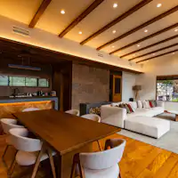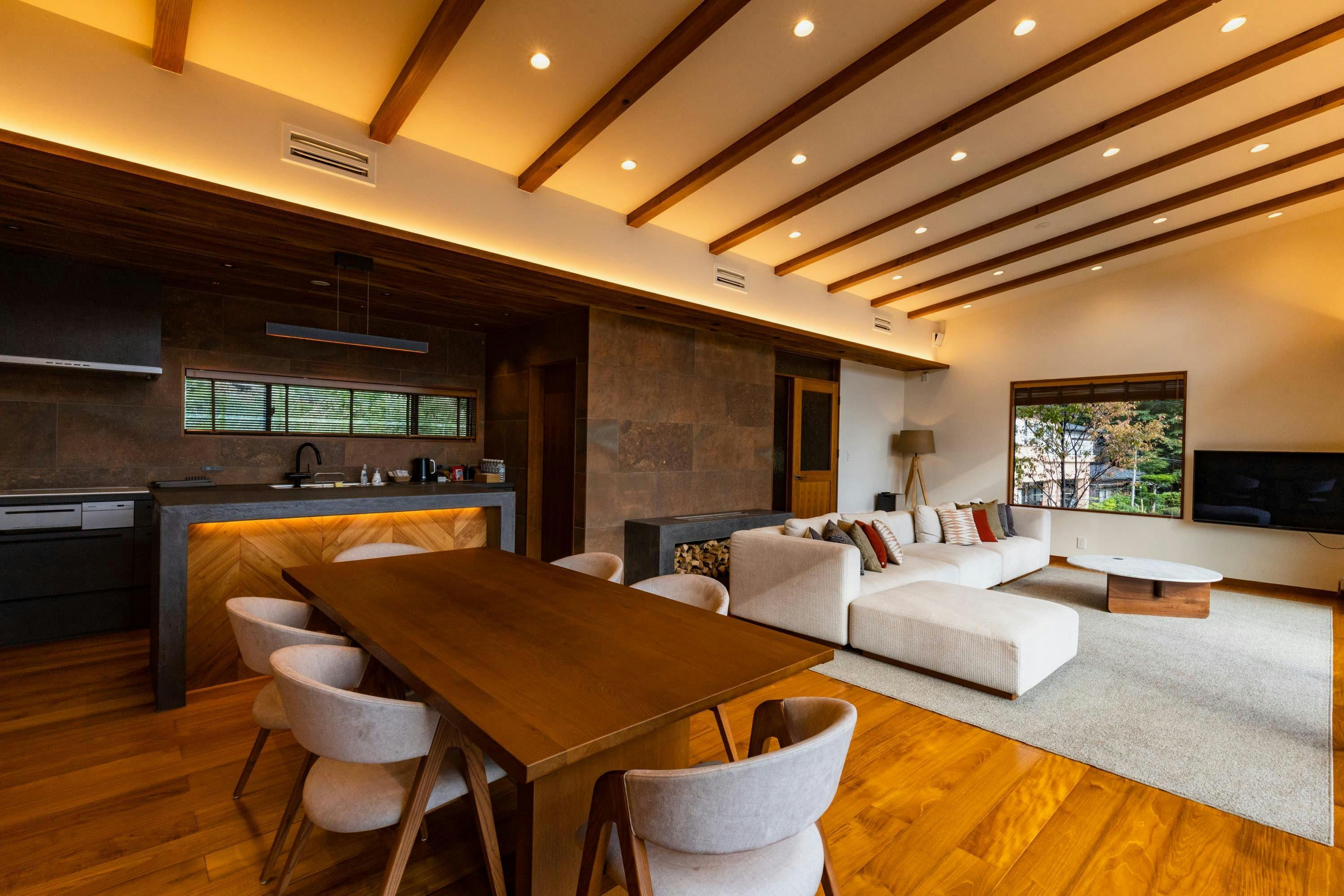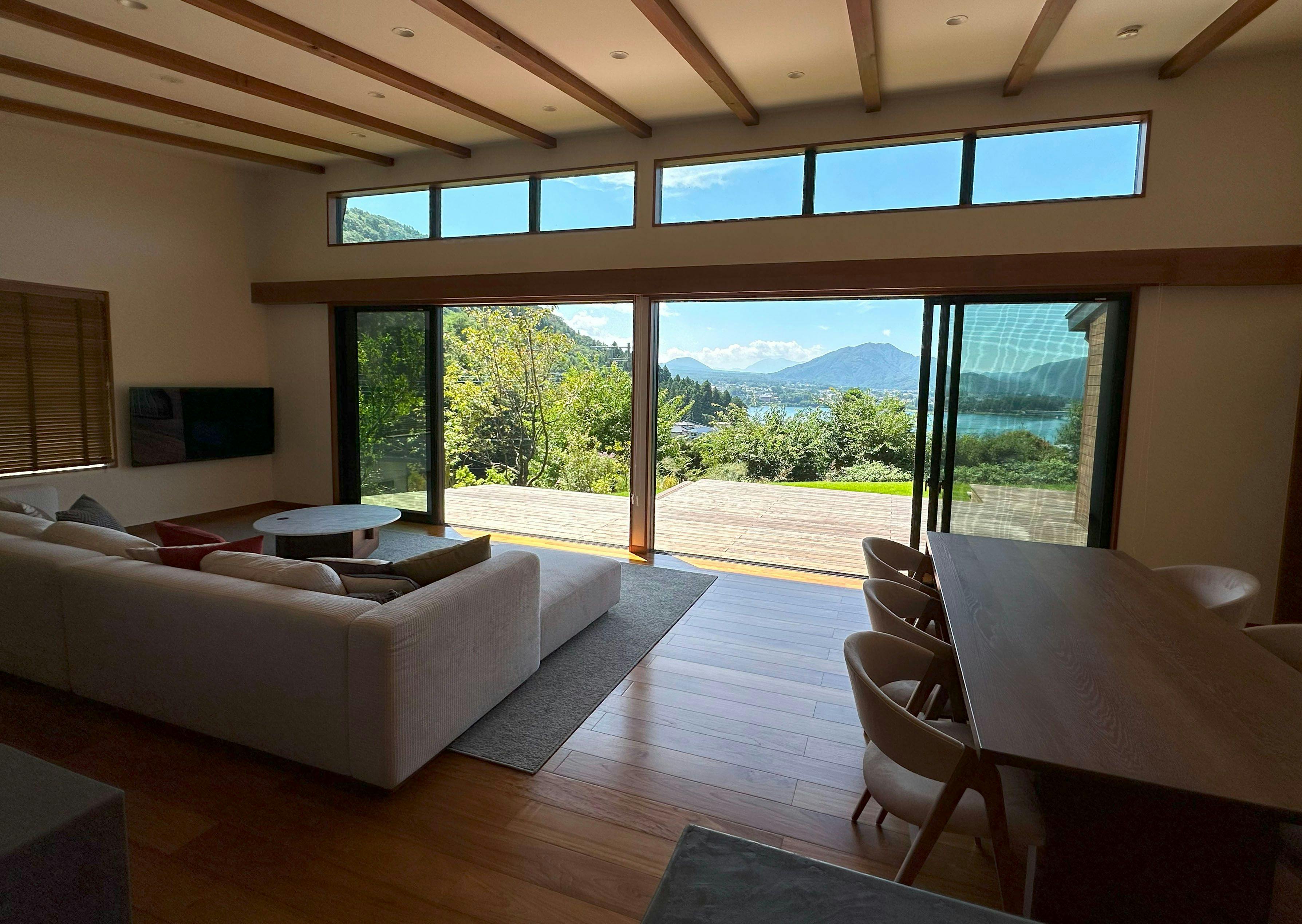 少し高台に建つこの建物は、どの部屋からも、河口湖と黒岳から連なる山並みが広がり見渡せます。 河口湖上祭の日には花火が正面に見えるのも、特別な一日をお届けする Villa Yamagara の特徴の一つです。 また、少し歩けば湖畔を散歩でき、近くには日帰りで入れる温泉もあります。レストランやロープウェーなどの観光地へも比較的近いため便利で、河口湖を満喫したい方にはぜひお越しいただきたいです。 1日1組限定、一棟まるまる貸し切りのこのヴィラにてぜひのんびりお過ごしください。