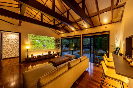 箱根・仙石原の自然に囲まれた1800平米の敷地に佇む、1日1組限定のプライベート温泉宿「箱根懐來」。平屋造りの邸宅と和の庭園が広がり、非日常のくつろぎを体感いただけます。室内はリビングと寝室の2部屋構成で、最大大人4名様まで宿泊可能。檜の内風呂や露天風呂、1℃単位で温度調整できるプライベートサウナ、大迫力の映像を楽しめるプロジェクターも完備。夕食には、地元食材を使用した黒毛和牛のしゃぶしゃぶまたはすき焼きをご用意いたします。