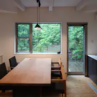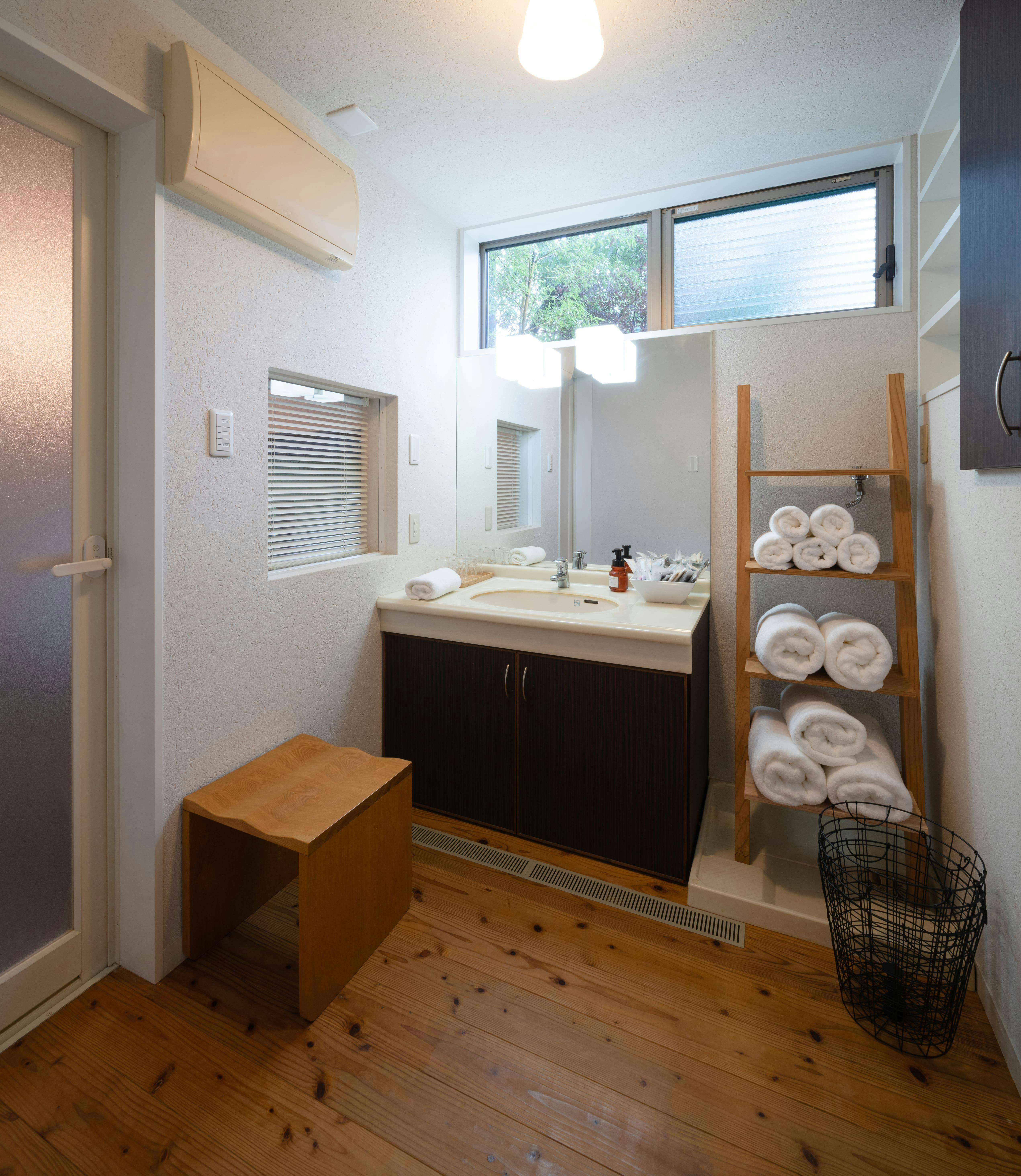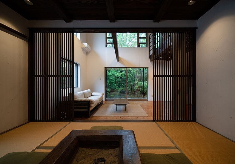 森のトンネルを抜け、里山にあるような一棟の宿。 自然素材を使った漆喰の壁や、うずくりの天然床が裸足に気持ち良い。 鳥の声を聞き、広いデッキで苔むした庭を眺め、自然を楽しめる里山空間。