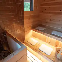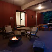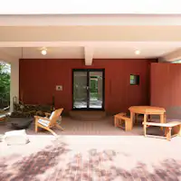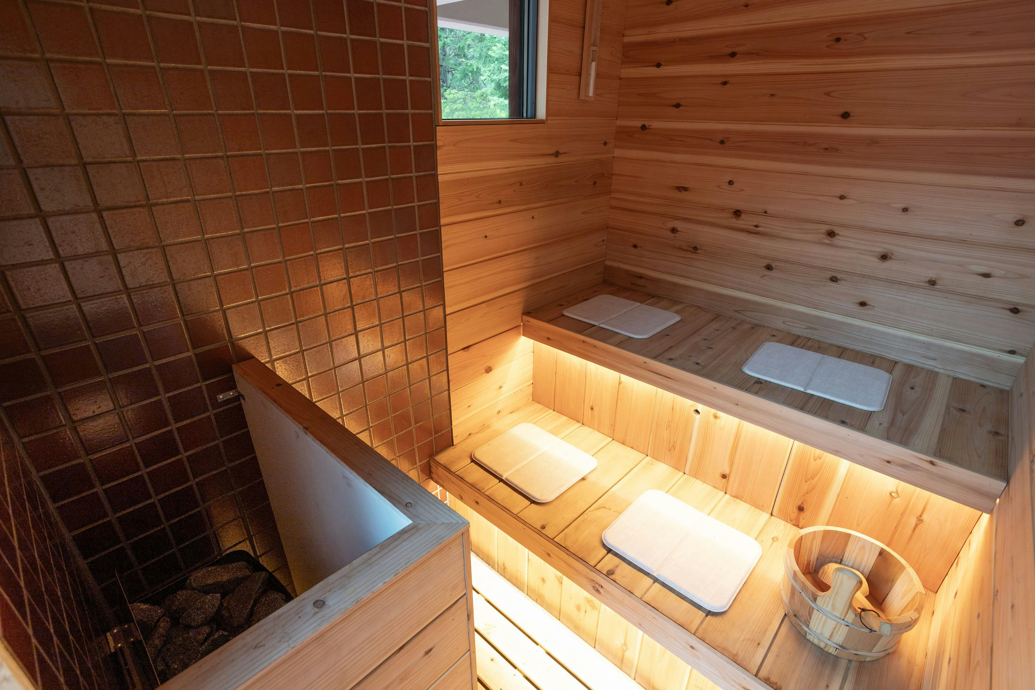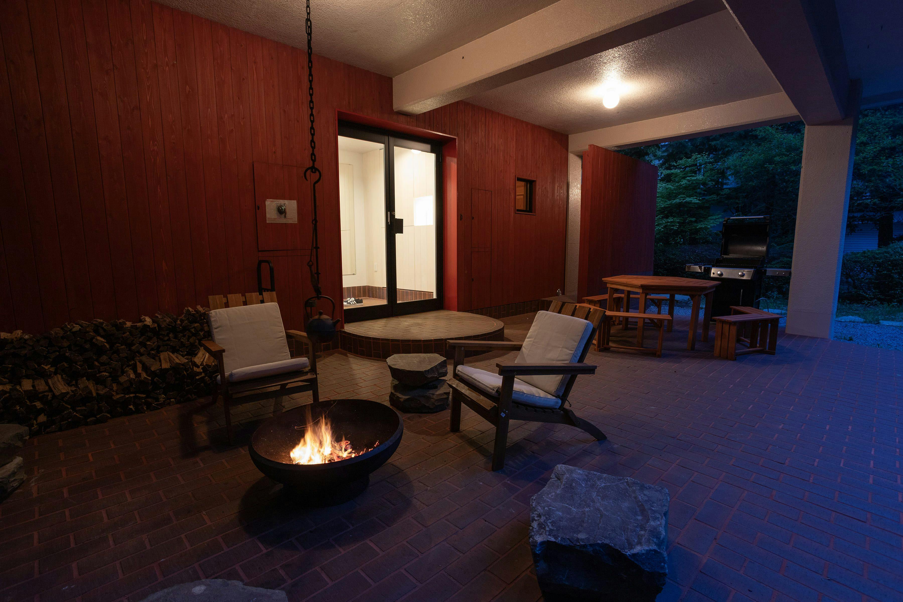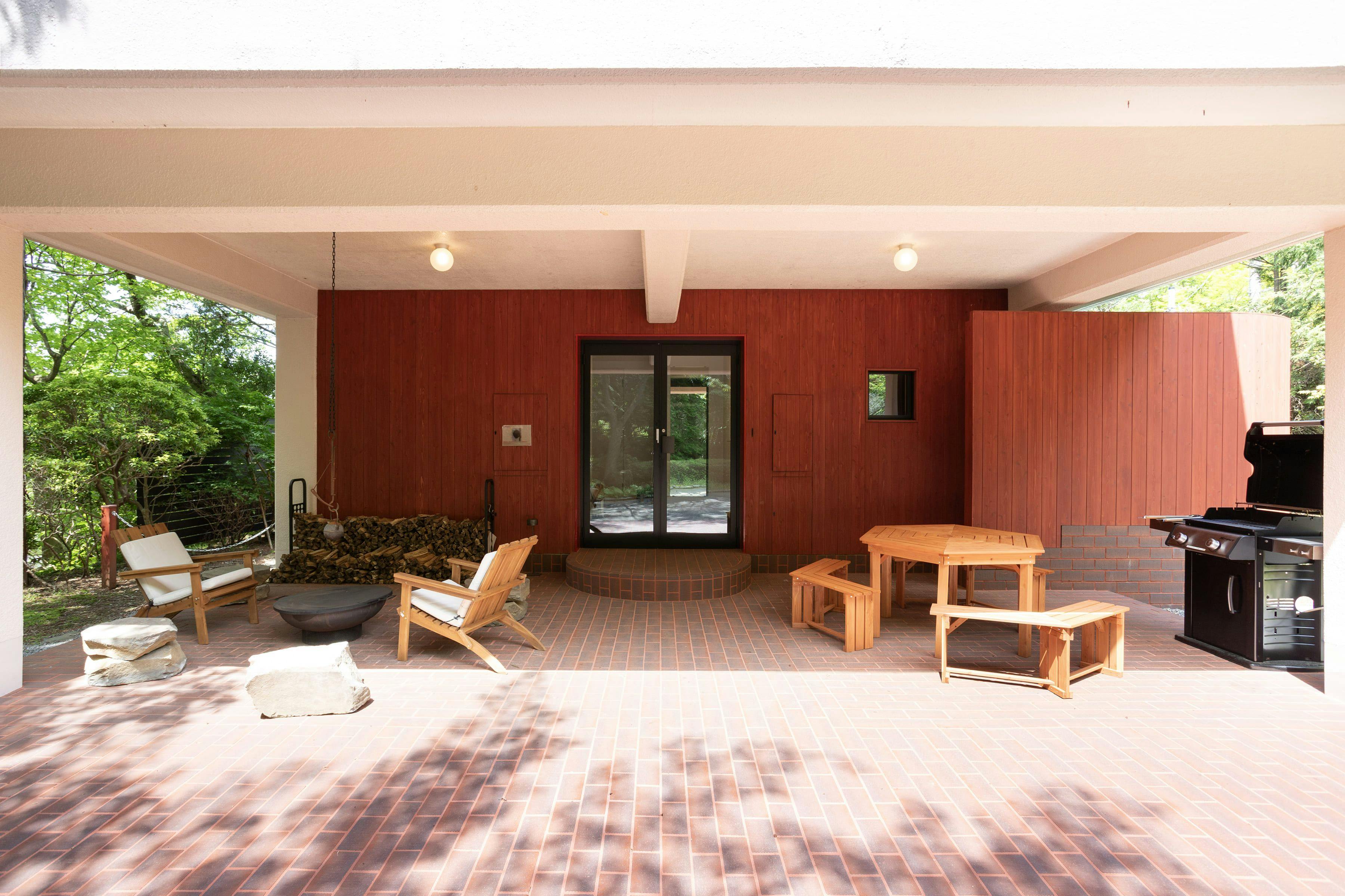 周囲を木々に囲まれたプライベート空間で、家族やグループ旅行に最適です。 和室も完備しており、小さなお子様連れのご家族にも安心です。 BBQ・焚き火スペースが1Fピロティスペースにあり、自然に囲まれながらも雨の心配をすることなくお楽しみいただけます。サウナが直結しているので、そのまま汗を流しに向かい、湯上がりにまた風に当たることも可能です。 リビングスペースは床暖房完備のため、寒い時期でも快適にお過ごしいただけます。