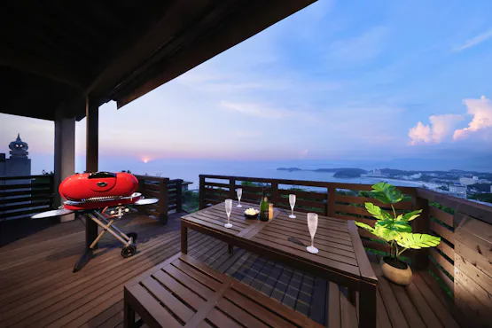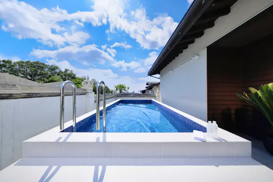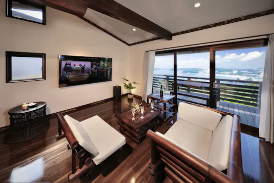 白浜の海を望む高台に建つ、全棟プライベートプール・温泉・サウナ付きの一棟貸切ヴィラ。 全棟愛犬とお過ごしいただけるバリ風デザインの開放的な空間で、愛犬との特別な時間をお過ごしいただけます。