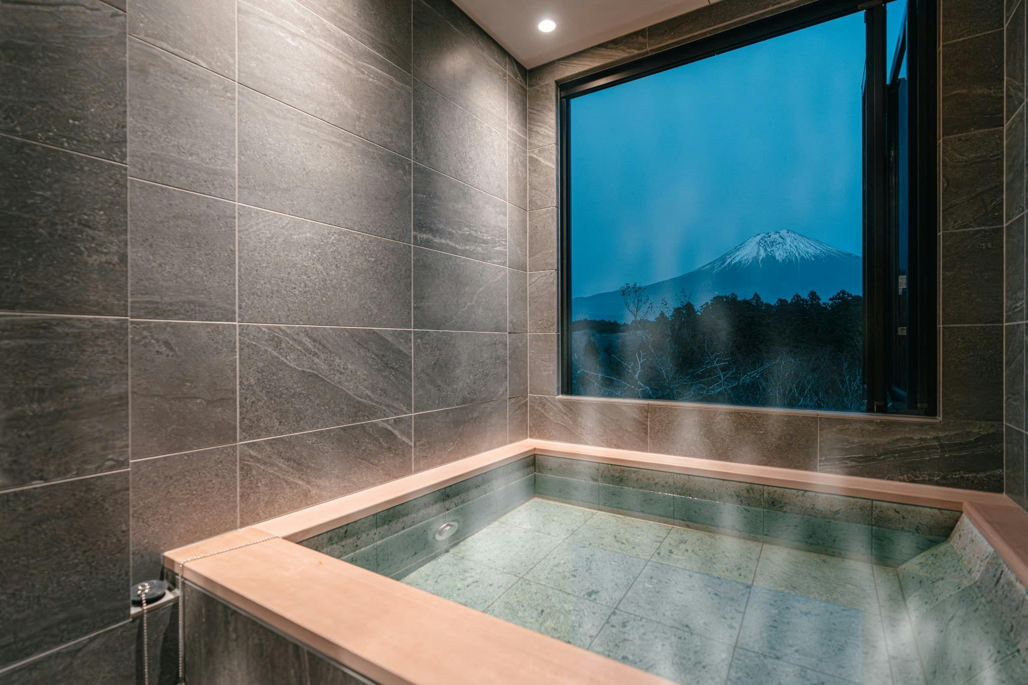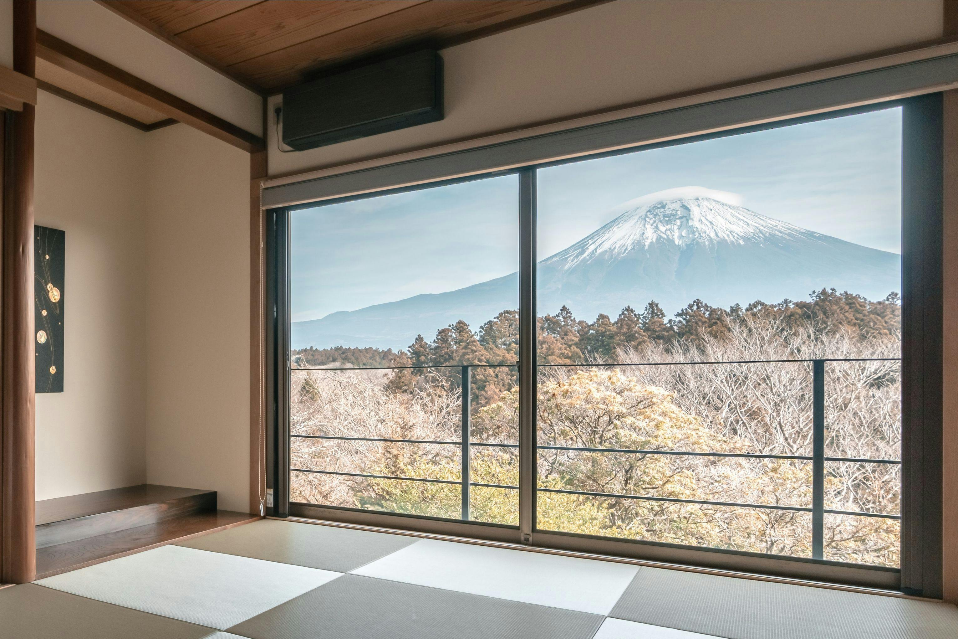 どの客室棟からも眼前に広がる富士山を一望可能 お部屋には大きなガラス窓を取り入れ、 遮るものなく富士山をご覧いただけます。 裾野まで広がる富士山の絶景を、 お客様だけの空間でお楽しみください