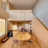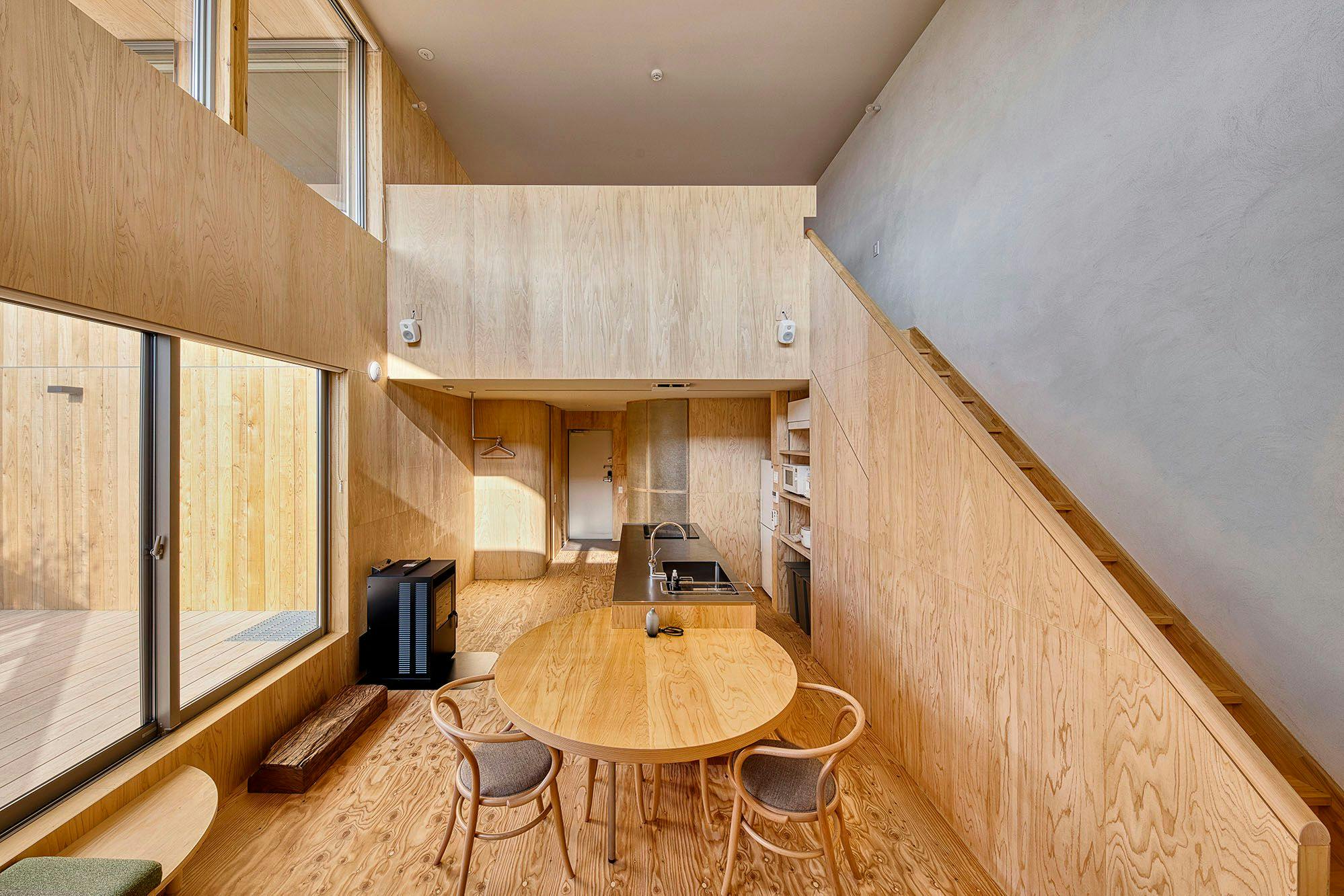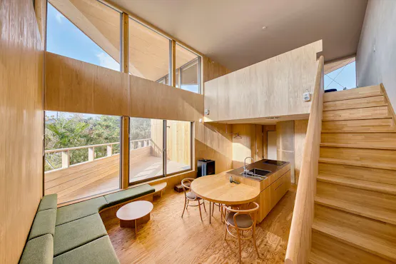 2棟が空に向かって両手を広げるように配置された、美しい連棟・メゾネットタイプの建築。 地域産サンブスギを使った外壁は、やわらかな質感で周囲の緑に溶け込みます。 リビングとベッドスペースがフロアで分かれ、大人4名でもゆったりと寛げる広さを確保。 徒歩5分ほどの<SANU 2nd Home 一宮1st>拠点内には、Overview Coffee(ベーカリーカフェ)やSoil Work(ワークスペース)もあり、朝食やワーケーションにも便利です。