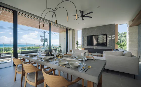 那覇空港から車で約50分。南城市・安座間ビーチの穏やかな海を望む、贅沢なプライベートヴィラです。 約250平米の3LDKを一棟貸切で利用でき、グループやご家族での滞在に最適。 館内にはプライベートプールとサウナを備え、非日常のリゾート時間をお愉しみいただけます。 3階の開放的なリビング&テラスでは、海風を感じながら食事や語らいのひとときを。 全3室のベッドルーム(セミダブルベッド6台)は広々と快適で、2か所のバスルームを設けています。 無料Wi-Fiや家電も充実し、長期滞在にも対応。靴を脱いで寛げる室内はお子様連れにも安心です。 沖縄南部の自然と静寂に包まれた極上のラグジュアリーステイをお過ごしください。