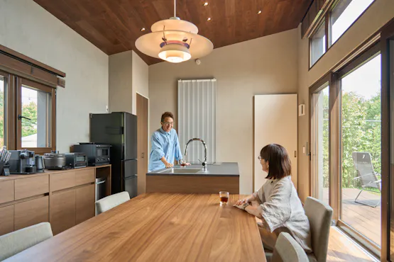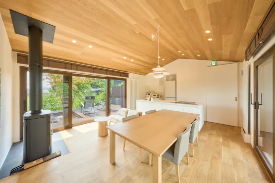 全棟に、輻射式の冷暖房パネルを標準装備。 風を出さず、音も立てないため、室内は常に穏やかで快適な空気環境が保たれます。 暖房は室内をムラなく包み込むように暖め、冷房はやさしく熱を吸収。 エアコン特有の乾燥感や風による不快感を抑え、長時間滞在でも心地よさが続きます。