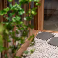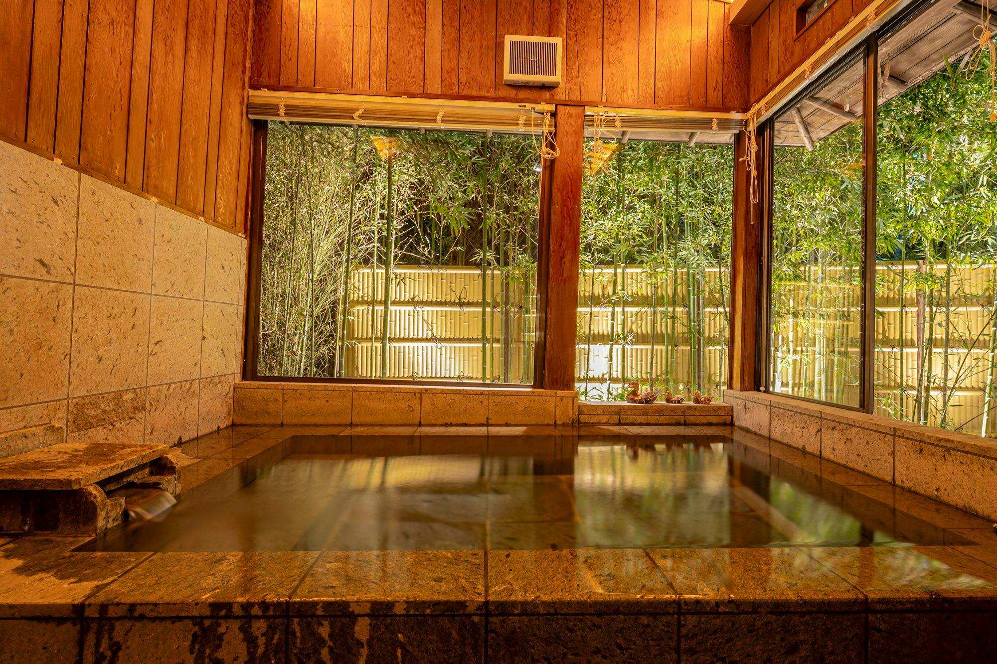 石造りの温泉に浸かりながら趣のある庭を眺める寛ぎの癒し空間