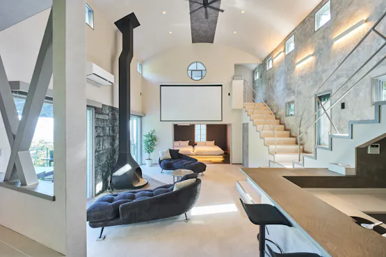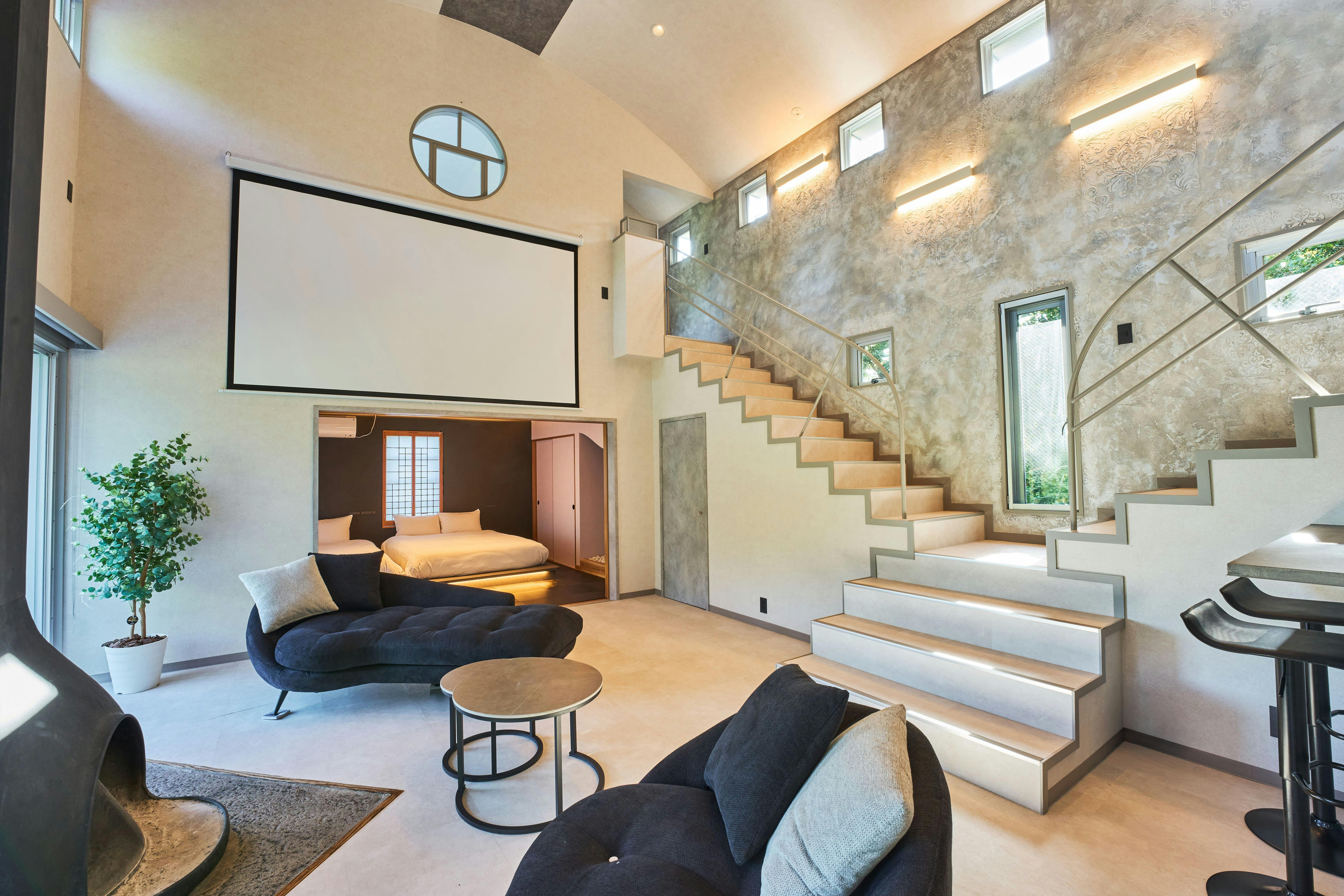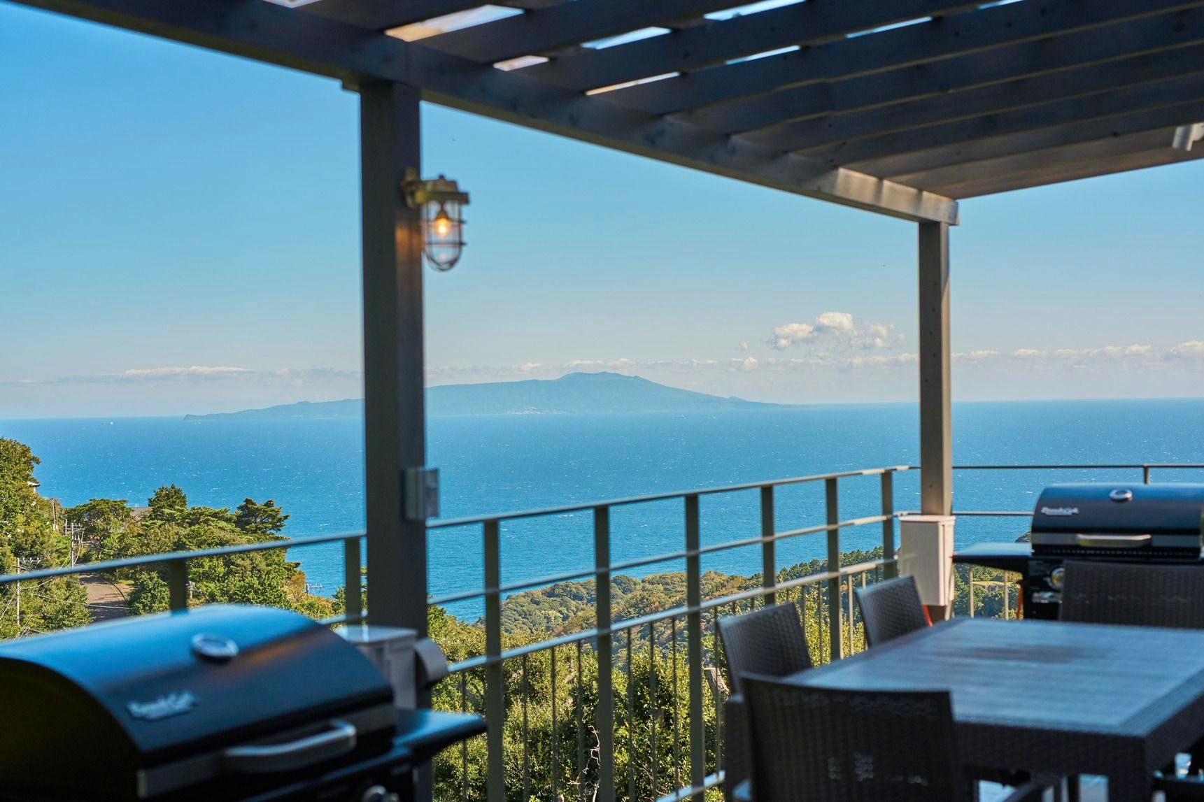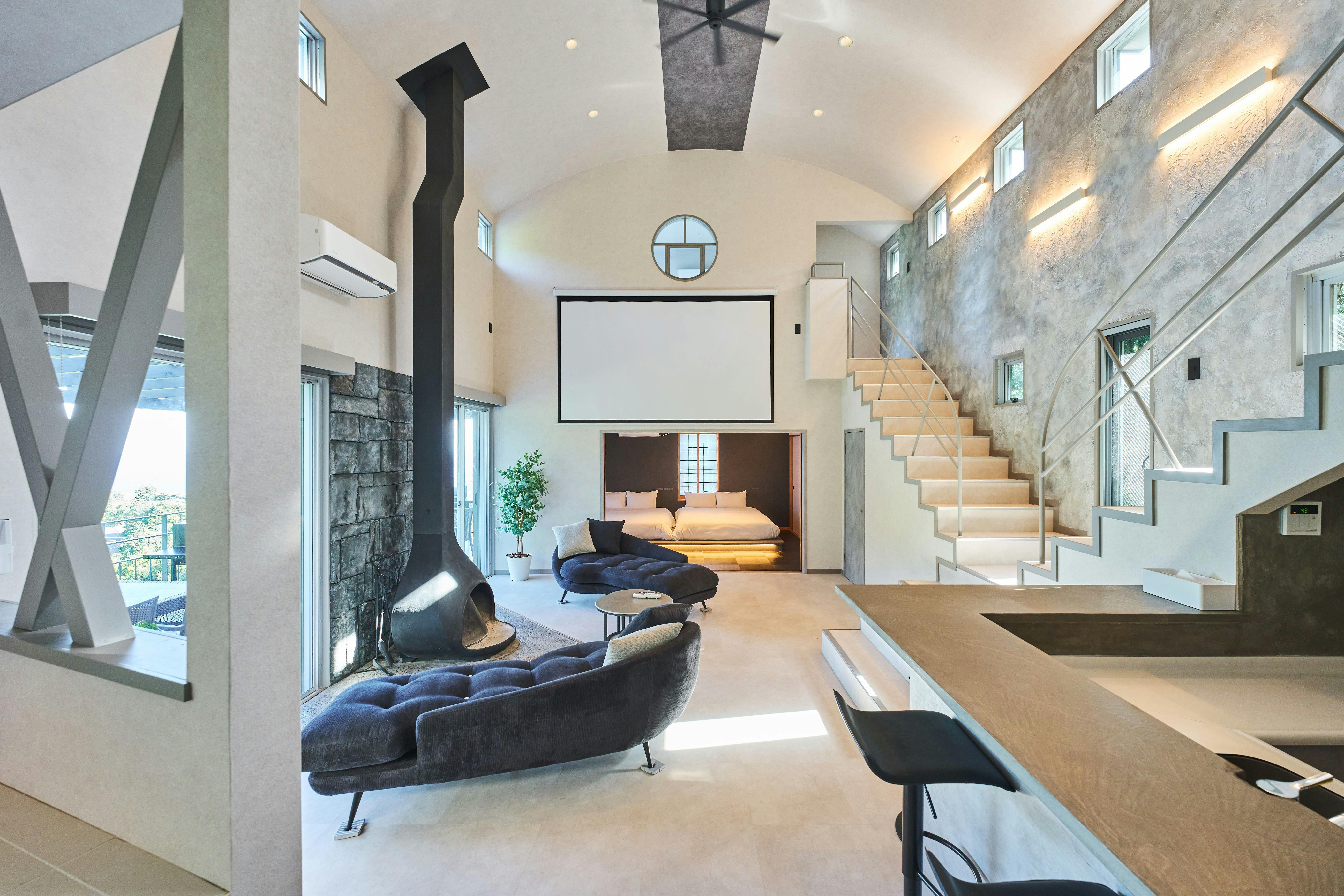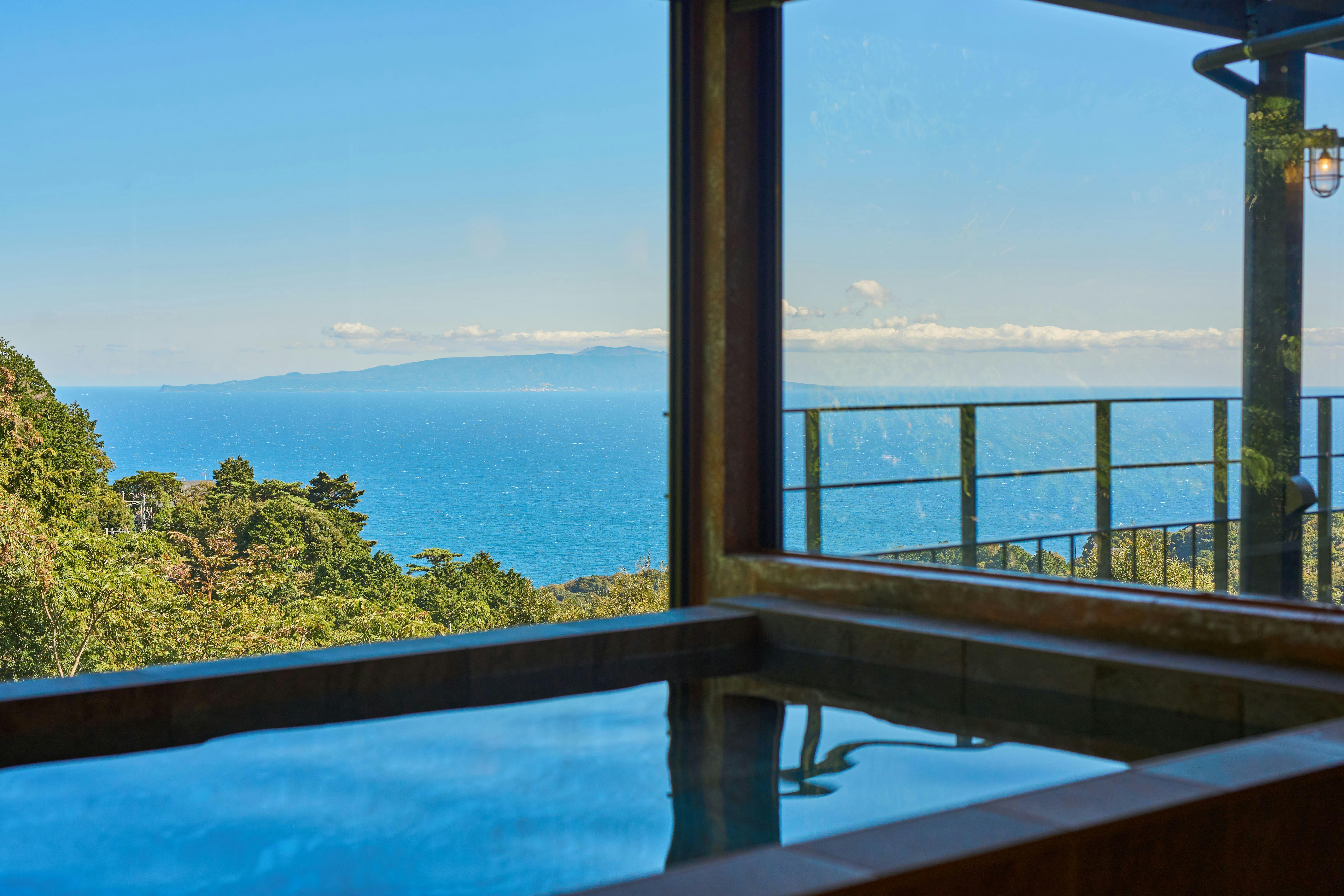目の前に広がる大島と紺碧の海、遮るもののない空、深い緑に包まれた静寂の森。 この絶景を堪能できるのが、伊豆熱川のプライベートヴィラ「グラン熱川」。 高台に佇むヴィラからは、季節ごとに表情を変える雄大な自然が一望できます。 碧く輝く海と大島を望みながら、贅沢なひとときをお楽しみいただけます。 室内には天然温泉を贅沢に使用した内湯に加え、本格的なサウナと水風呂も完備 夜は、大画面プロジェクターで映画や動画を楽しむシアター空間に。 4つの寝室を備え、最大16名まで宿泊可。 ファミリー旅行はもちろん、グループでの集まりや多世代でのご利用にも最適です。 洗練されたインテリアと心地よい空間が、特別な一日に彩りを 最寄り駅の熱川駅から車で約8分。 忙しい日常を離れ、“癒し”に身を委ねる場所へ。