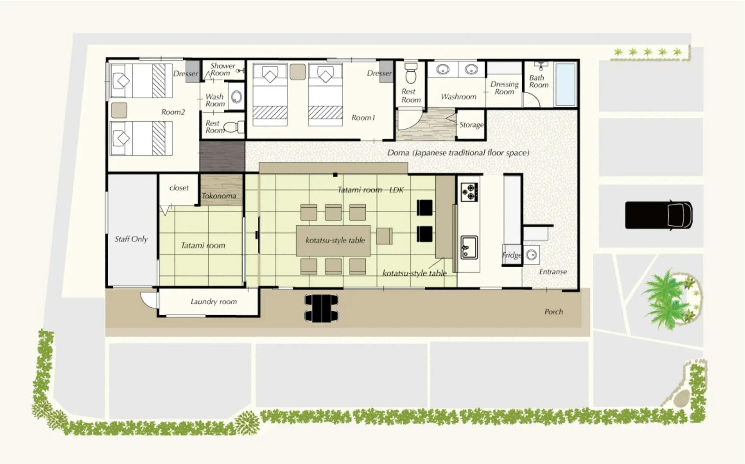 周囲を気にせず過ごせる広々とした敷地に構える、完全独立型の平屋ヴィラ。 掘りごたつや土間、琉球畳のリビングなど、どこか懐かしさを感じる空間は、ご家族や大切な仲間を自然とひとつにしてくれます。 周辺は車通りも少なく、聞こえてくるのは風の音と鳥のさえずりだけ。小さなお子様連れでも安心してお過ごしいただけます。 2家族でのグループ旅行やトライアスロンの合宿、長期滞在にも最適な、ゆとりある造りです。 前浜の青い海を間近に感じながら、のんびりと、時を忘れるようなひとときをお過ごしください。
