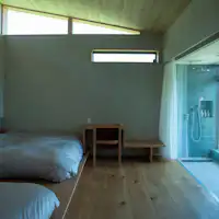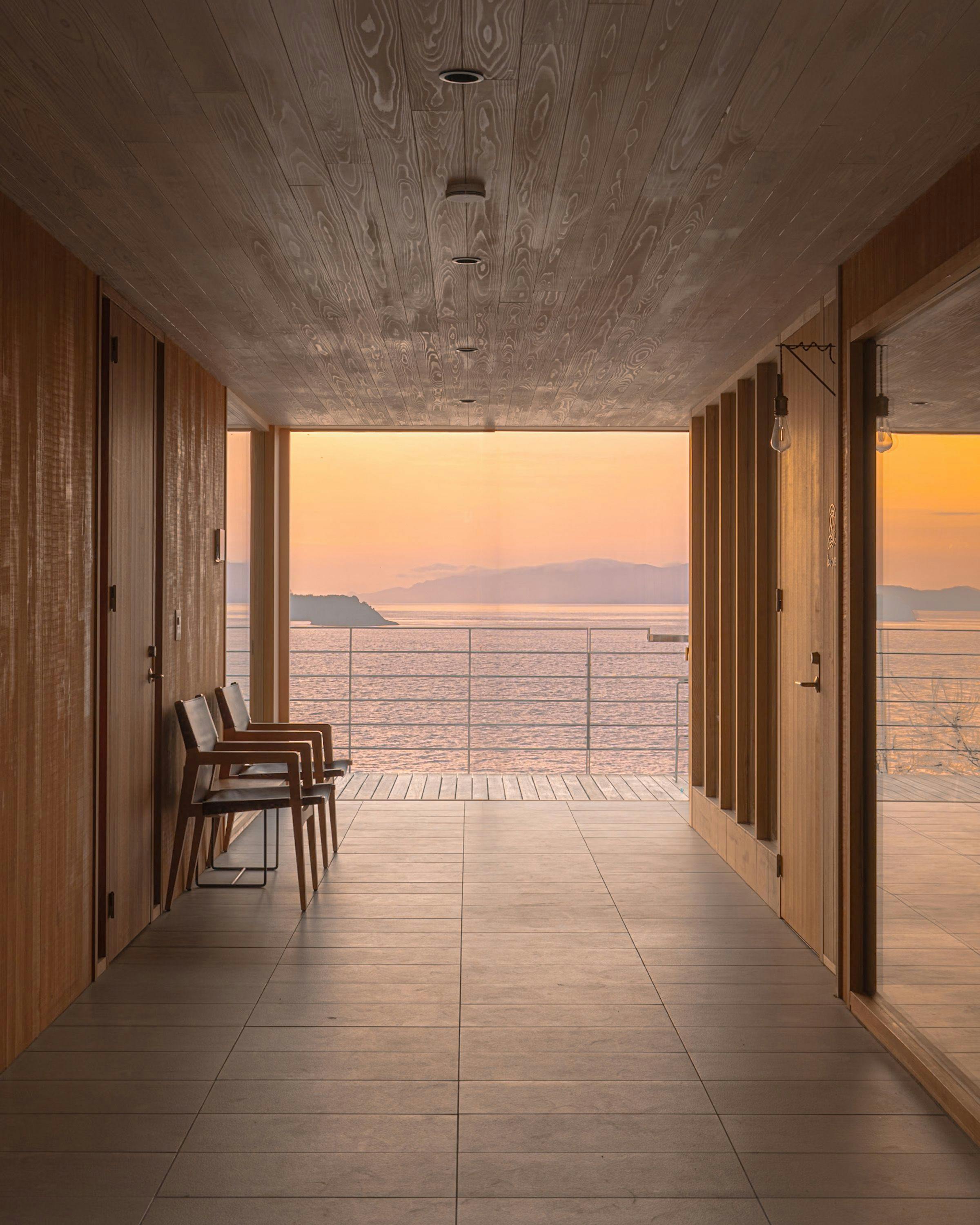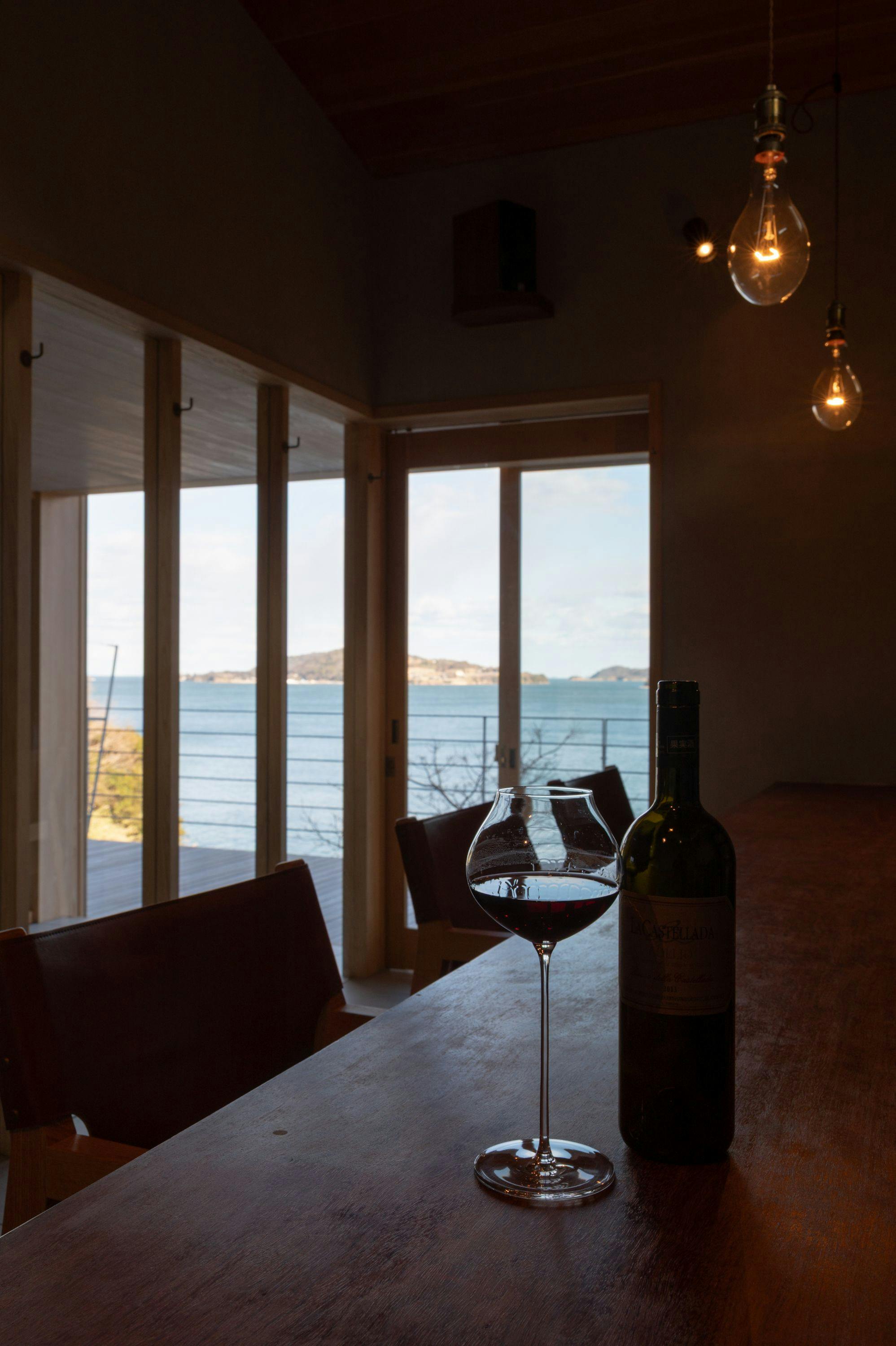 海と島々の境から昇る朝日が室内をやさしく満たし、光と自然が静かに溶け合う場所、「七二七inlet」。 海と空と風と、身も心もひとつになるバスルームでは、鳥のさえずりと波の音に耳を傾け、刻々と移ろう景色とともに、身も心も解きほぐすひとときをお過ごしいただけます。 夜は光の落ちるセラーから今宵のワインを選び、グラスを傾けると、耳に届くのは波の音。喧騒を離れ、穏やかで満ち足りた滞在をお届けいたします。