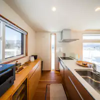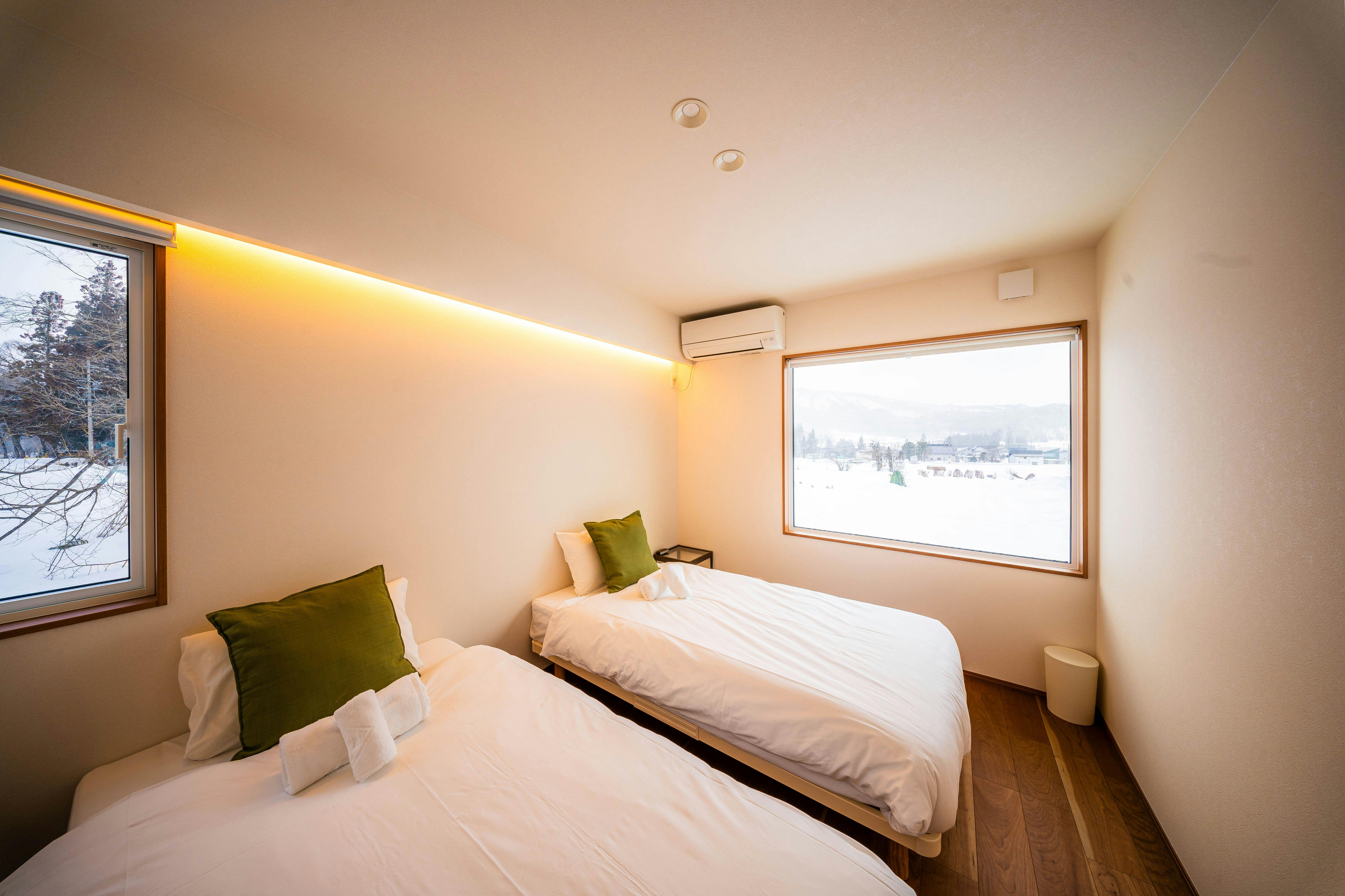 1バスルームに加えトイレを2つ備え、グループや家族での滞在にも安心です。 専用の給水タンク付き屋外ラグジュアリーサウナ、広々としたBBQスペース、くつろぎの焚き火エリアを完備。 四季を通して、ゆったりとした時間をお楽しみいただけます。