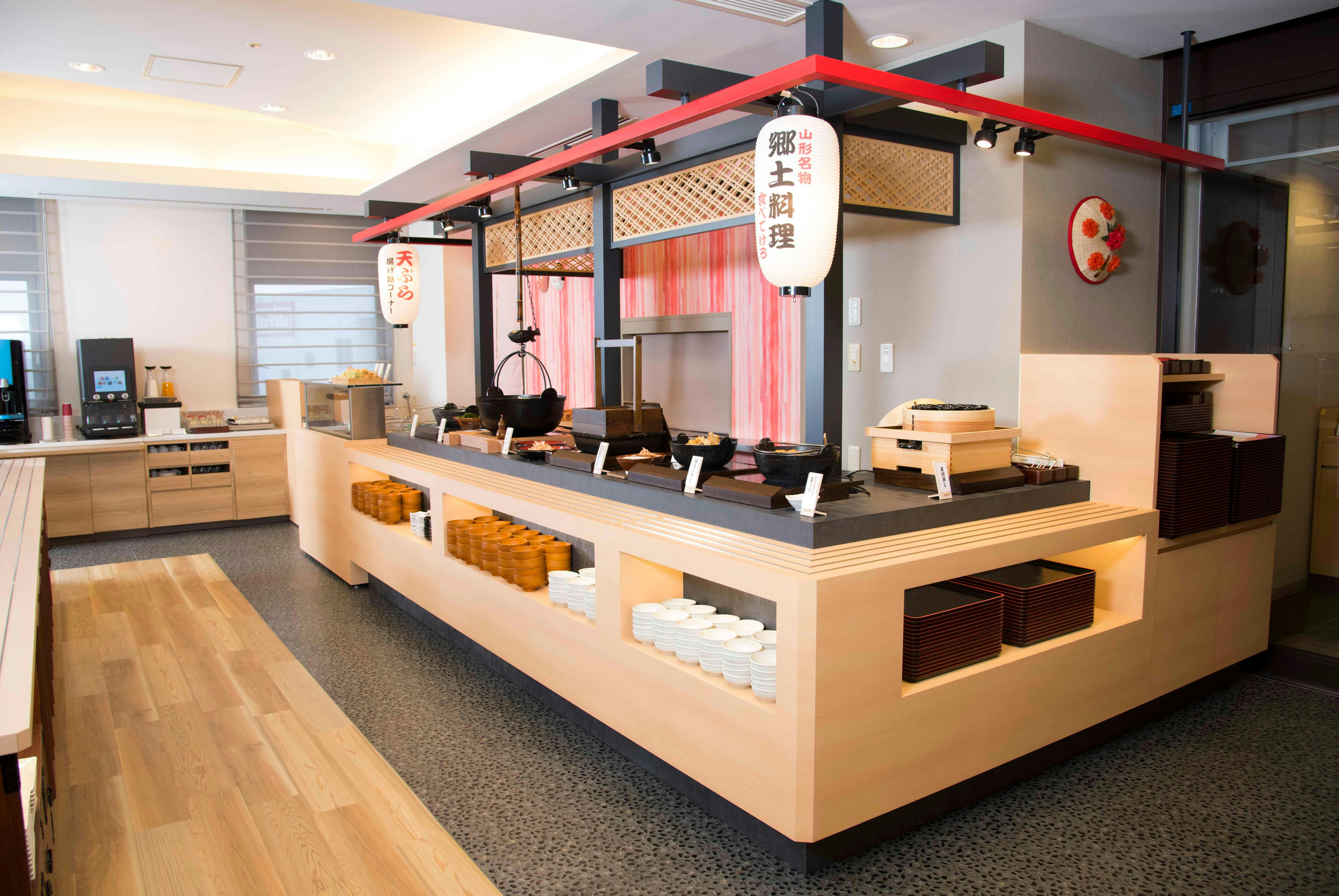 お好きな料理をお取りいただける「ビュッフェスタイル」で提供しております。 大人2300円 小学生1000円 幼児無料 山形の郷土料理『山形自慢の芋煮汁』や県産米『つや姫』がお楽しみいただけます。 【営業時間】 平日 6:30~ 9:30 土・日・祝 6:30~10:00