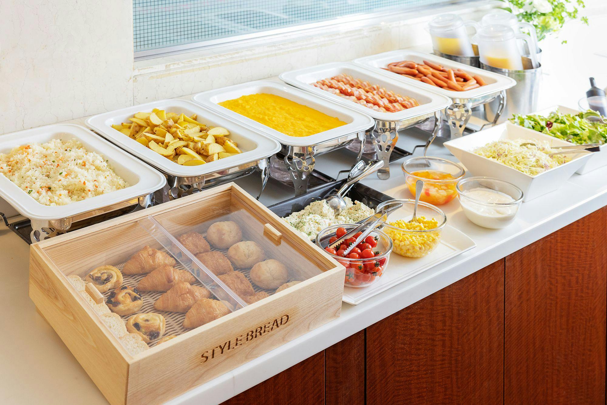 ■朝食ブッフェ■ ヘルシーでバランスのとれた洋食メニューをブッフェスタイルでご用意しております。 ・天然酵母パンの4種(APOバター使用クロワッサンなど) ・ピラフ、チキンライスなどのライス ・サラダ *以下のお料理は日替わりでご用意いたします。 ・たまご料理(スクランブルエッグ、オムレツより1種) ・お肉料理(ベーコン、ウインナー等より2種) ・スープ(コーンスープ、コンソメスープより1種) 営業時間/6:30 ~ 10:00(最終入店9:30)