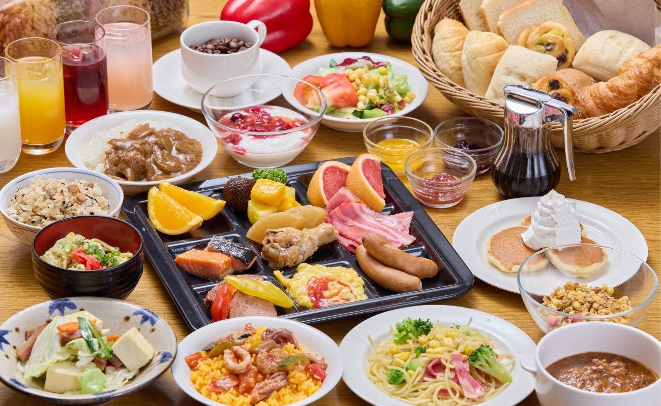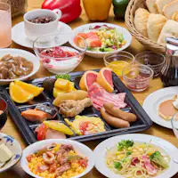| 朝食 | 場所:2階「久米-Kuninda-」 時間:6:30 ~ 10:00 料金:大人2500 円/ 小人1500 円 (税・サ込) 1 日の活力源である朝食はブッフェスタイルで。 約50種類の和洋琉メニューをお好きなだけお召し上がりください。 |