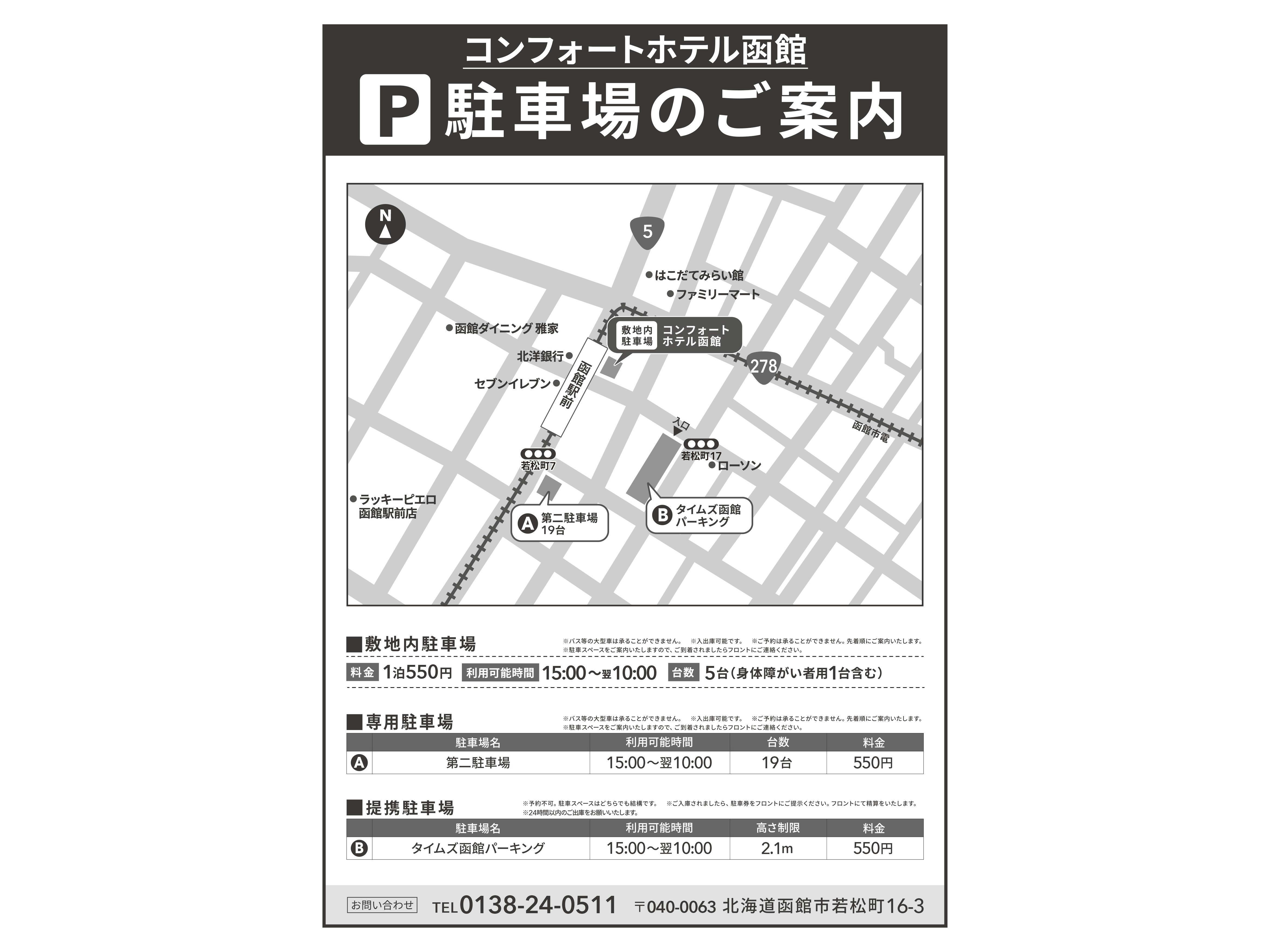 ・料金: 宿泊者一泊あたり 550円 ・駐車時間: 15:00~翌10:00 ・駐車場スペース: 車長 --- 車幅 --- 車高 --- ・駐車場台数: 5台 ・バレーサービス: なし -------------------------------- ■駐車場 敷地内駐車場5台(身体障害者用1台分含む) 1泊(15:00~翌10:00)550円 先着順 ※番号の指定がございますので、フロントまでお越しください 専用駐車場19台 1泊(15:00~翌10:00)550円 ※番号の指定がございますので、フロントまでお越しください 提携駐車場 1泊(15:00~翌10:00)550円 高さ制限2.1m ※24時間以内のご出庫をお願い致します。