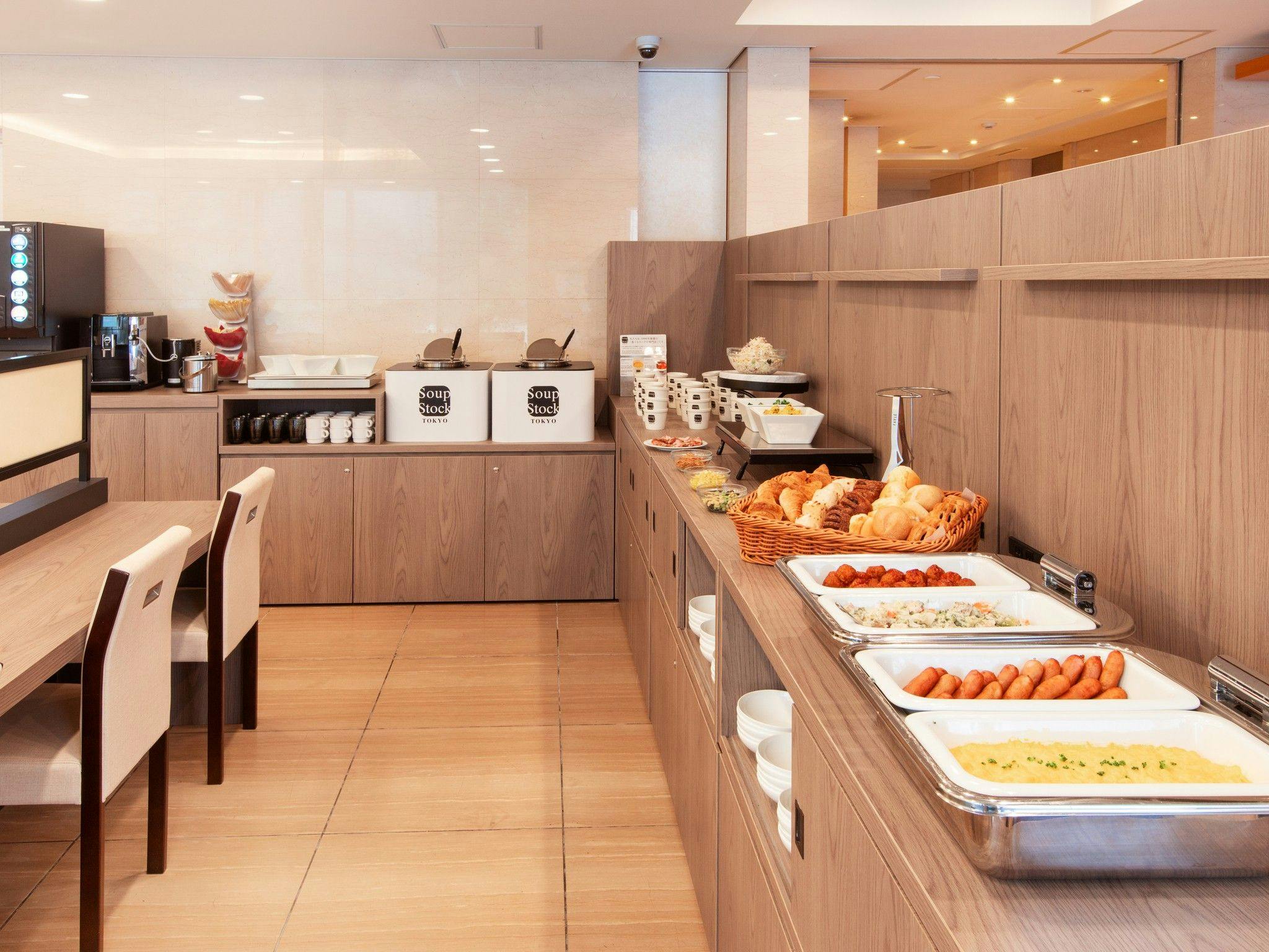 | 朝食 | 場所:ロビーラウンジ 時間:6:30~9:30(CLOSE) 【提供内容】 ・Soup Stock Tokyo スープ* 提供例:オマール海老のビスク・とうもろこしとさつま芋のスープ ・温製料理(スクランブルエッグ、ソーセージ、肉料理*) ・冷製料理(ハム等) ・パン ・サラダ*(ポテトサラダ等) ・フルーツ ・ヨーグルト ・ドリンク(ジュース・コーヒー) *日替わりメニュー |