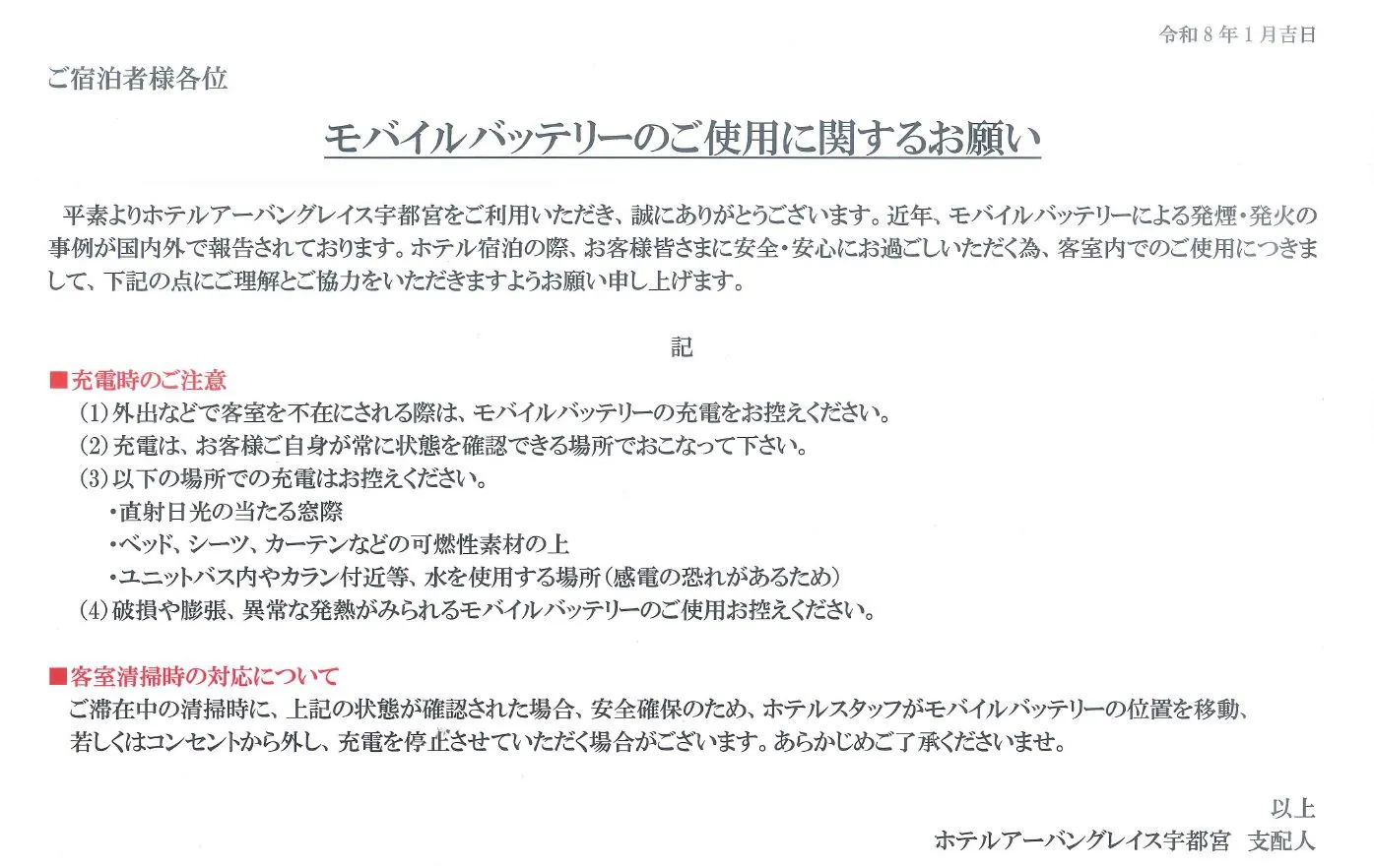 平素よりホテルアーバングレイス宇都宮をご利用いただき、誠にありがとうございます。近年、モバイルバッテリーによる発煙・発火の事例が国内外で報告されております。ホテル宿泊の際、お客様皆さまに安全・安心にお過ごしいただく為、客室内でのご使用につきまして、下記の点にご理解とご協力をいただきますようお願い申し上げます。