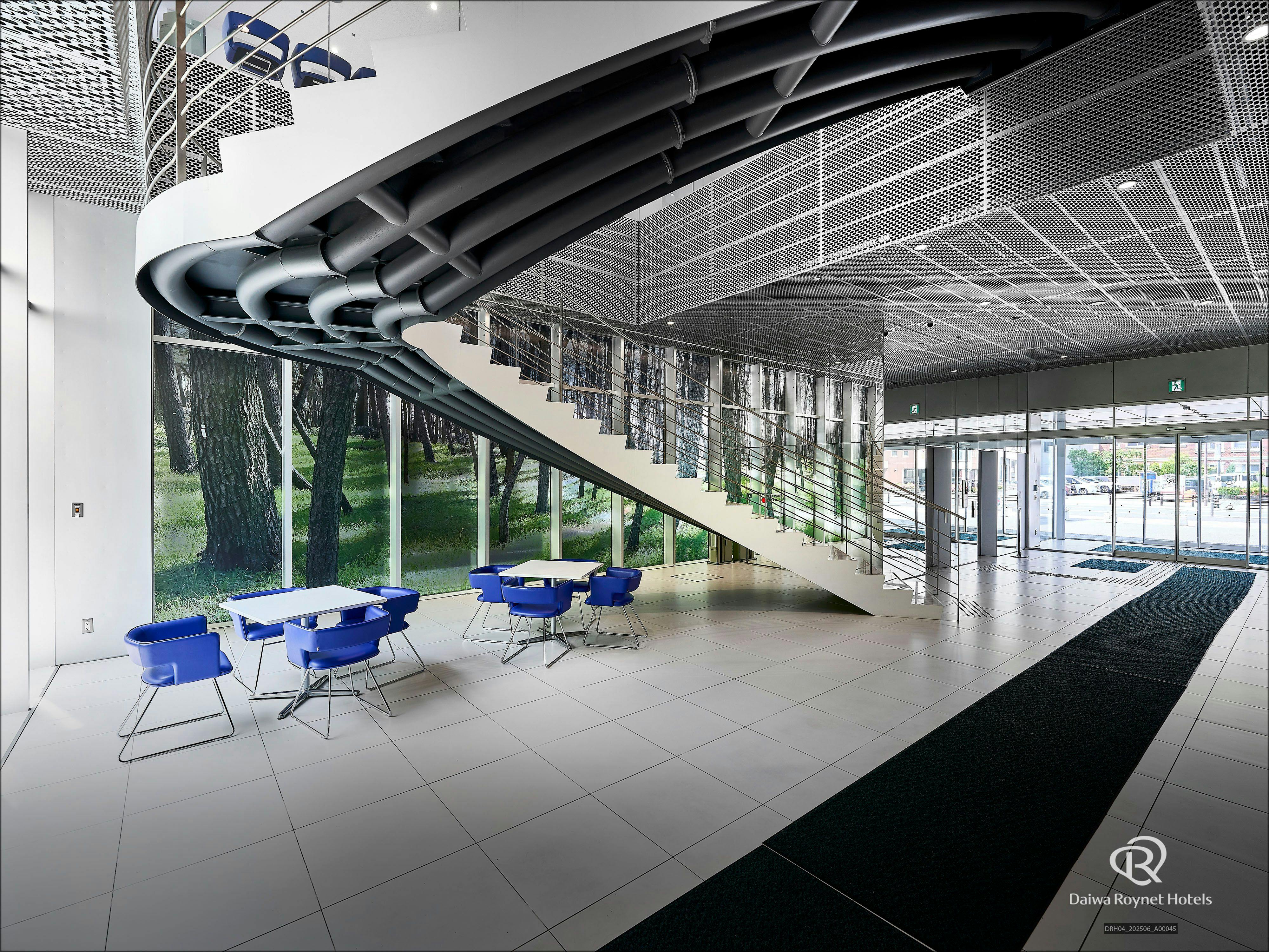 曲線が印象的な階段、又はエレベーターで2階フロント・ロビーへお越しください。