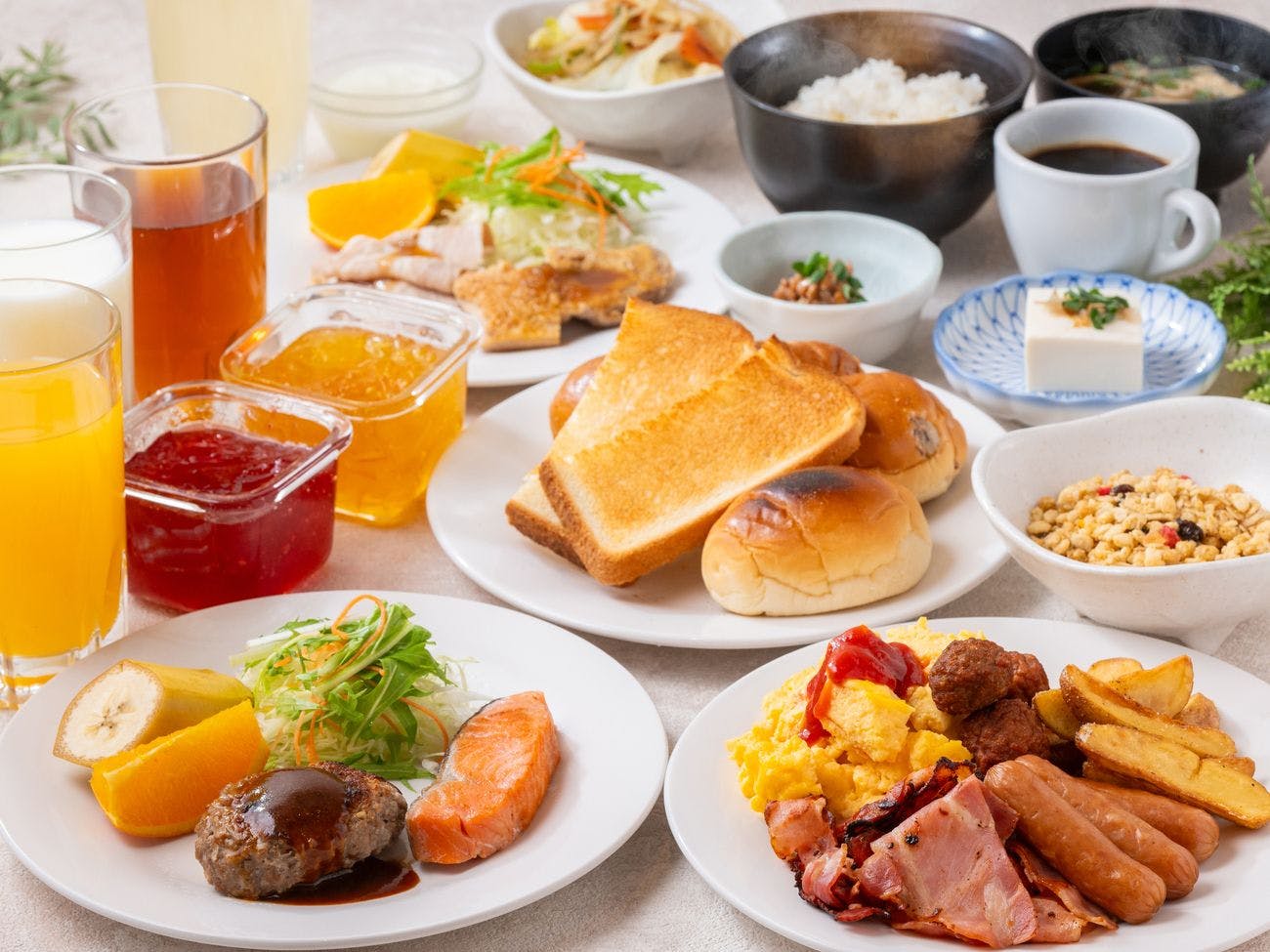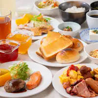 | 朝食 | ●営業時間 6:30-10:30(ラストオーダー10:00) ●朝食メニュー メイン2種と日替り和洋ビュッフェ メイン2種とサイドメニュー1種はオーダーを頂きます。 ●料金 一般:前売り1,600円 当日1,800円 お子様(4歳~11歳):800円 幼児(3歳以下):無料 |