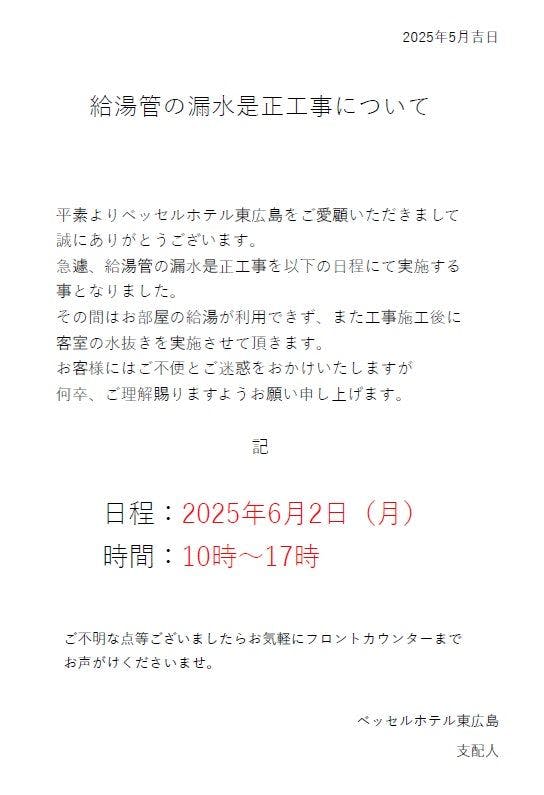 いつもベッセルホテル東広島をご愛顧いただき、誠にありがとうございます。
