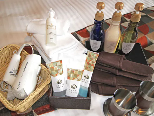 以下のアメニティをご用意しております。 シャンプー・リンス・ボディソープ・石鹸・タオル・バスタオル・ボディタオル・スポンジ・ハミガキセット・くし・ブラシ・ドライヤー・髭剃り・シェービングジェル・フォーム・ナイトウェア・スリッパ・洗顔料・綿棒・衣類の消臭スプレー・冷蔵庫・湯沸しポット・お茶セット(無料)・テレビ・金庫・有料放送・ビデオ・オン・デマンド
