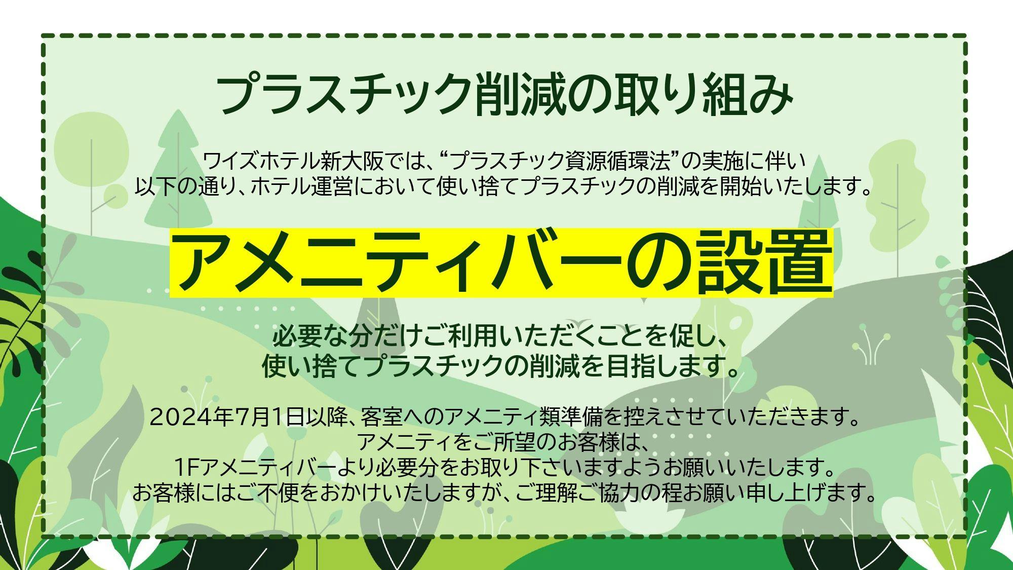 ワイズホテル新大阪は、新型コロナウィルス対応ガイドラインに則り、感染拡大防止策を実施致します。 1.スタッフのこまめな手洗いとマスク着用を徹底致します。 2.施設内の定期的な換気を行います。 3.設備、器具などの定期的な消毒・洗浄を行います。 玄関・ロビー・レストランにアルコール消毒液を設置、 エレベーターのボタン、各ドアノブの消毒を実施して おります。 4.人と人との接触機会を減らすことに取り組みます。 一定の距離を確保するソーシャルディスタンシングを 実施します。 フロントカウンターに飛沫防止板の設置を行います。 5.ホテル内掲示やホームページなどを活用し、ホテルの 取組をお客様に積極的にお知らせします。 ワイズホテル新大阪