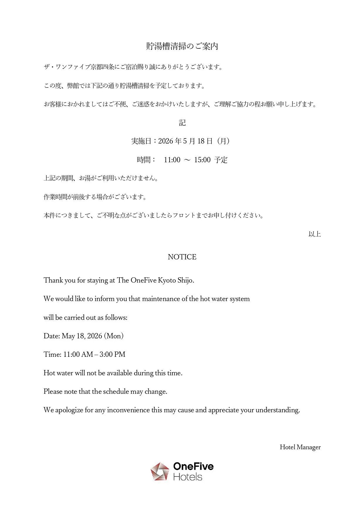 本件につきまして、ご不明な点がございましたらフロントまでお申し付けください。