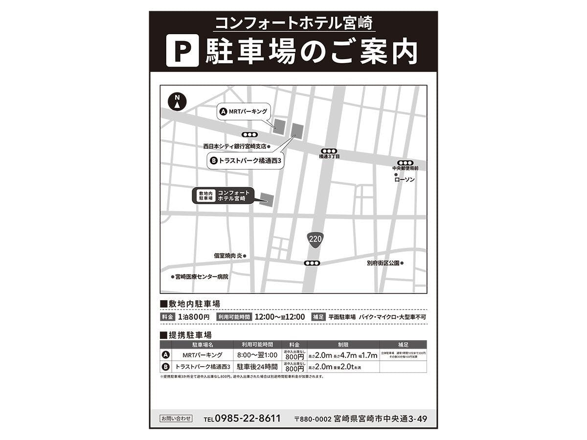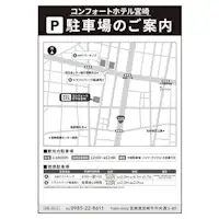・料金: 宿泊者一泊あたり 1,100円 ・駐車時間: 1泊 (12:00~翌12:00)1,100円 先着順 ・駐車場スペース: 車長 --- 車幅 --- 車高 --- ・バレーサービス: なし -------------------------------- 【駐車場について】 敷地内駐車場10台(平面、身体障碍者用1台含む) 1泊 (12:00~翌12:00)1,100円 先着順 ※途中入出庫なし ※車高制限なし(ワゴン車程度まで) ※バイク駐輪不可 ※マイクロバス不可 提携駐車場(3ヶ所) ■タイムズ宮崎ナナイロ(旧 ボンベルタ橘) 1泊(14:00~翌11:00)1,100円 ※途中入出庫なし 車両制限 全長5m 全幅1.9m 全高2.1m ※連泊の場合は停めたまま不可 ■MRTパーキング 車両制限 全長4.7m 全幅1.7m 全高2.0m 駐車後24時間 1,100円 ※途中入出庫なし ※深夜1:00~翌朝7:00までは駐車場内立ち入り不可 ■トラストパーク橘通西3 車両制限 全高2.0、重量2.0t未満 駐車後24時間 1,100円 ※途中入出庫なし