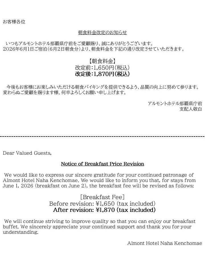 朝食料金の改定を行いますのでご案内させて頂きます。