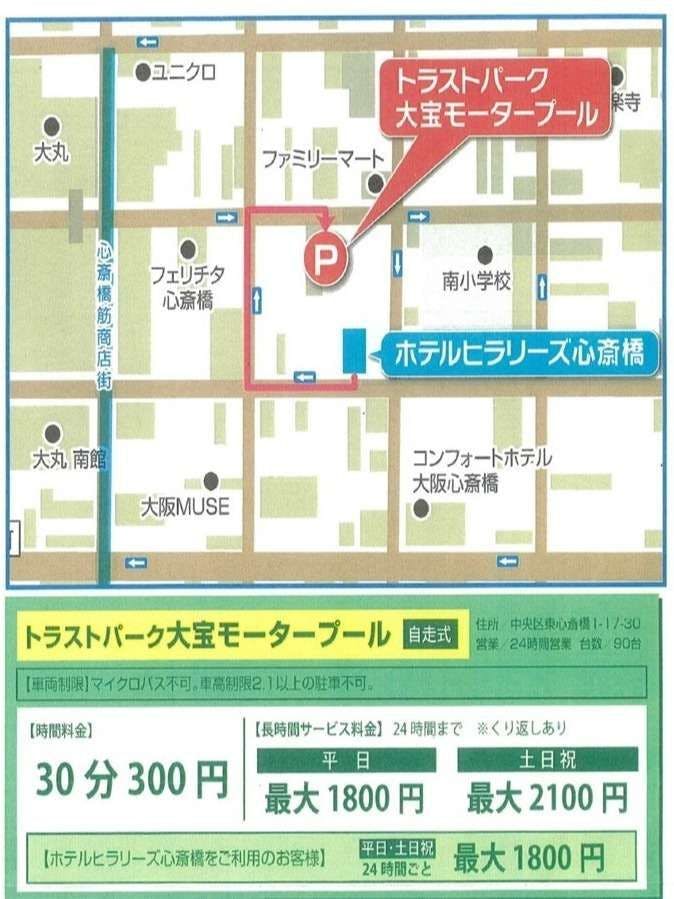 ・料金: 宿泊者一泊あたり 1,800円 ・駐車時間: 入庫後24時間 (以降30分毎に300円※提携先になります。 ・駐車場スペース: 車長 --- 車幅 --- 車高 2.1m ・駐車場台数: 90台 ・バレーサービス: なし 当ホテルには駐車場がございません。 提携駐車場のみになっております。 ホテルから徒歩3分 提携駐車場【トラストパーク 大宝モータープール】 ・ご予約出来かねます ・ホテルフロントにて駐車場の地図お渡し致します ・満車の場合は近隣のパーキングをご利用下さいませ。