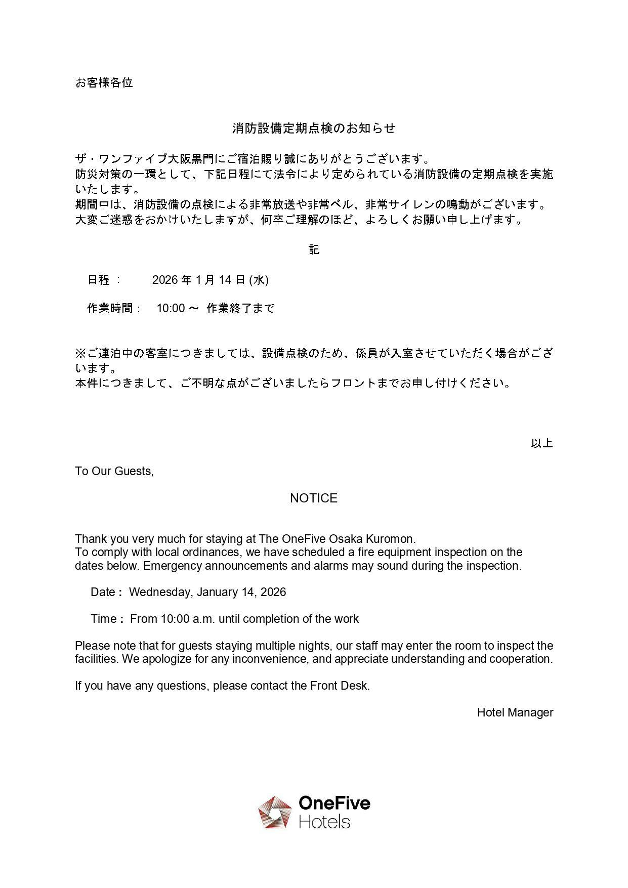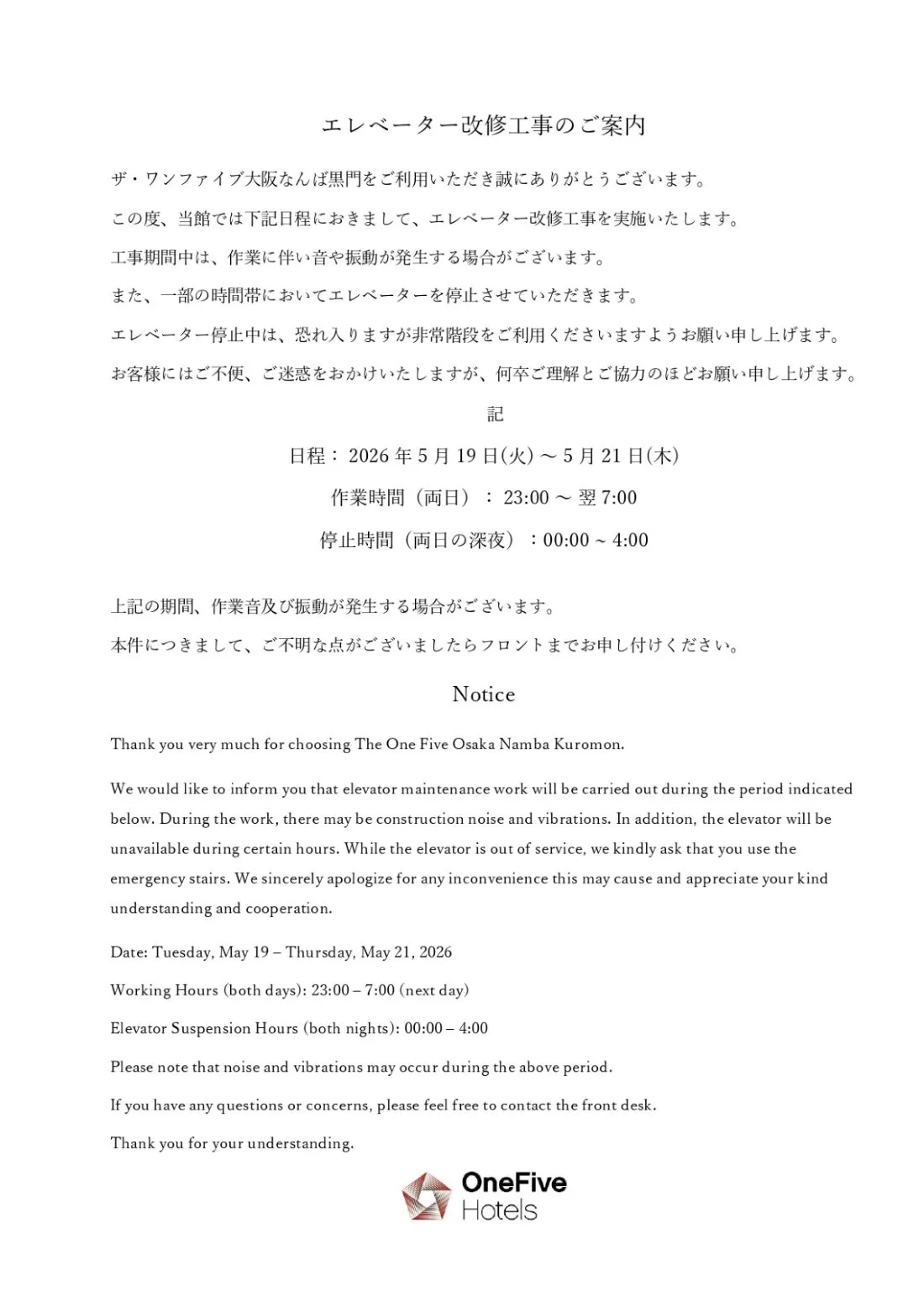 ザ・ワンファイブ大阪なんば黒門をご利用いただき誠にありがとうございます。