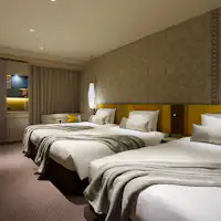 テーブルとゆったり寛げるソファを設えたゆとりあるお部屋。優雅なハリウッドツインでお寛ぎいただけます。 広さ:23.9平米 定員:2名 ベッド:1,200×1,960mm