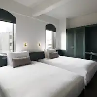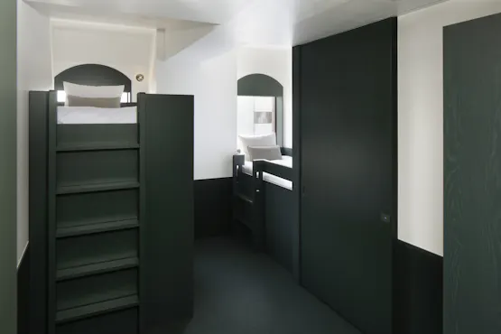 DDD HOTELが提案するのは、“本当に必要なものを、必要な分だけ、最高の品質で”という、ミニマル・ラグジュアリーな宿泊体験。窓から差し込む光で時間とともに表情を変える深いモスグリーンのプライベート空間は、コンパクトながらも心身を“再起動” するために必要なものが揃います。オリジナルマットレスや高級羽毛寝具、センシティブケアをテーマに取り揃えられたアメニティ類など、からだに触れるものだからこそ徹底してこだわり、厳選してご用意しております。