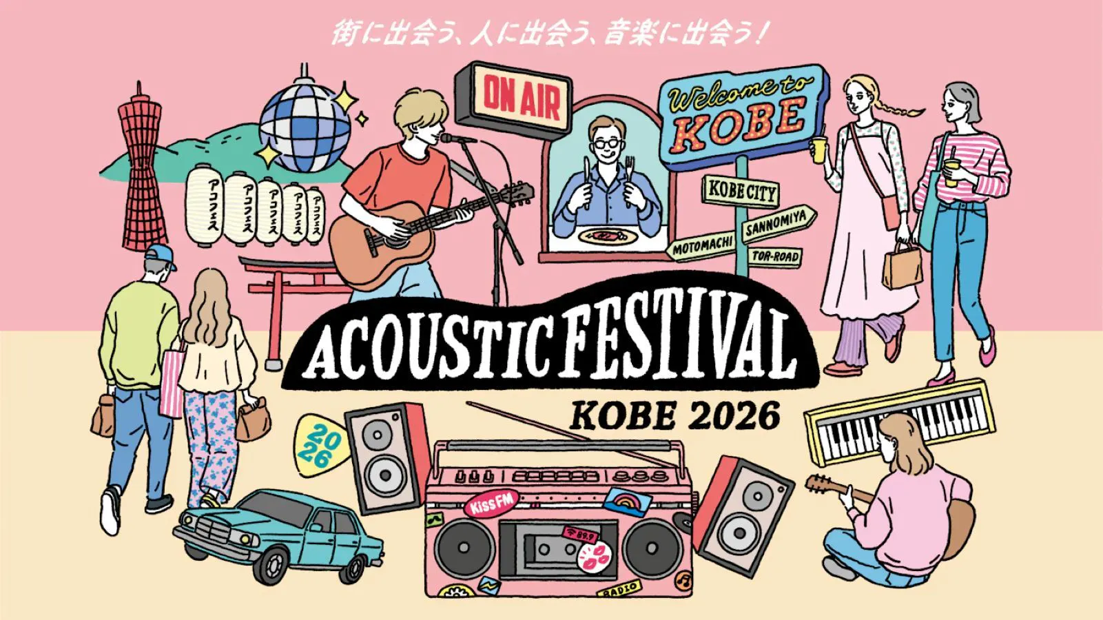 神戸の中心地で”街に出会う、人に出会う、音楽に出会う!” をコンセプトに、Kiss FM KOBEが主催するイベント「アコースティックフェスティバル」が2026年4月19日(日)に開催されます。