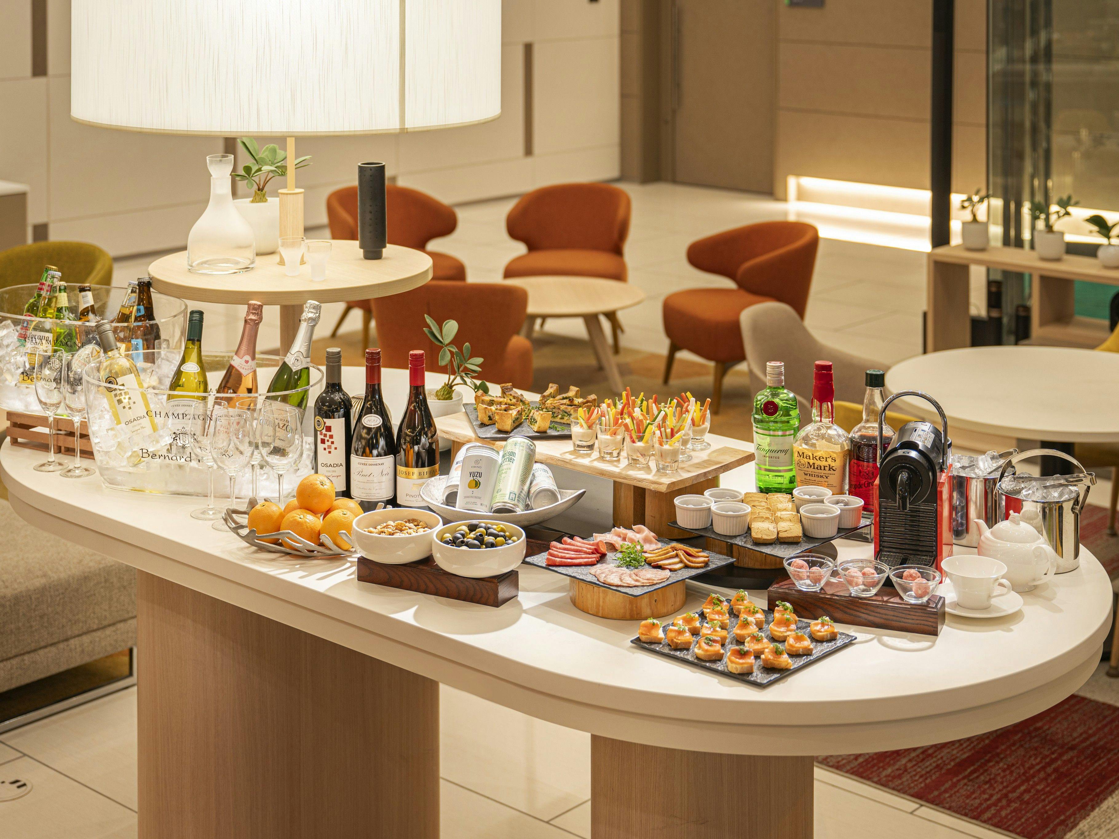 日の光をとりこむ大きな窓が特徴の開放感ある吹き抜けのロビーには、レストラン「Café Hi!」も併設されており、憩いのスペースとなっております。 電源コンセントや無料のwifiもご利用いただけ、サテライトワークにも最適です。