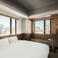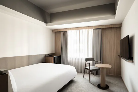すすきの、大通公園、狸小路、ショッピングエリア全てが徒歩圏内の好アクセス。全室が20平米以上の客室とシモンズ社製の快眠ベッドマットレスで皆さまに良い眠りをお約束いたします。大きな窓とシティビューの眺め。日差しの入る明るい客室です。夜はインテリアと間接照明がお部屋の雰囲気を演出します。